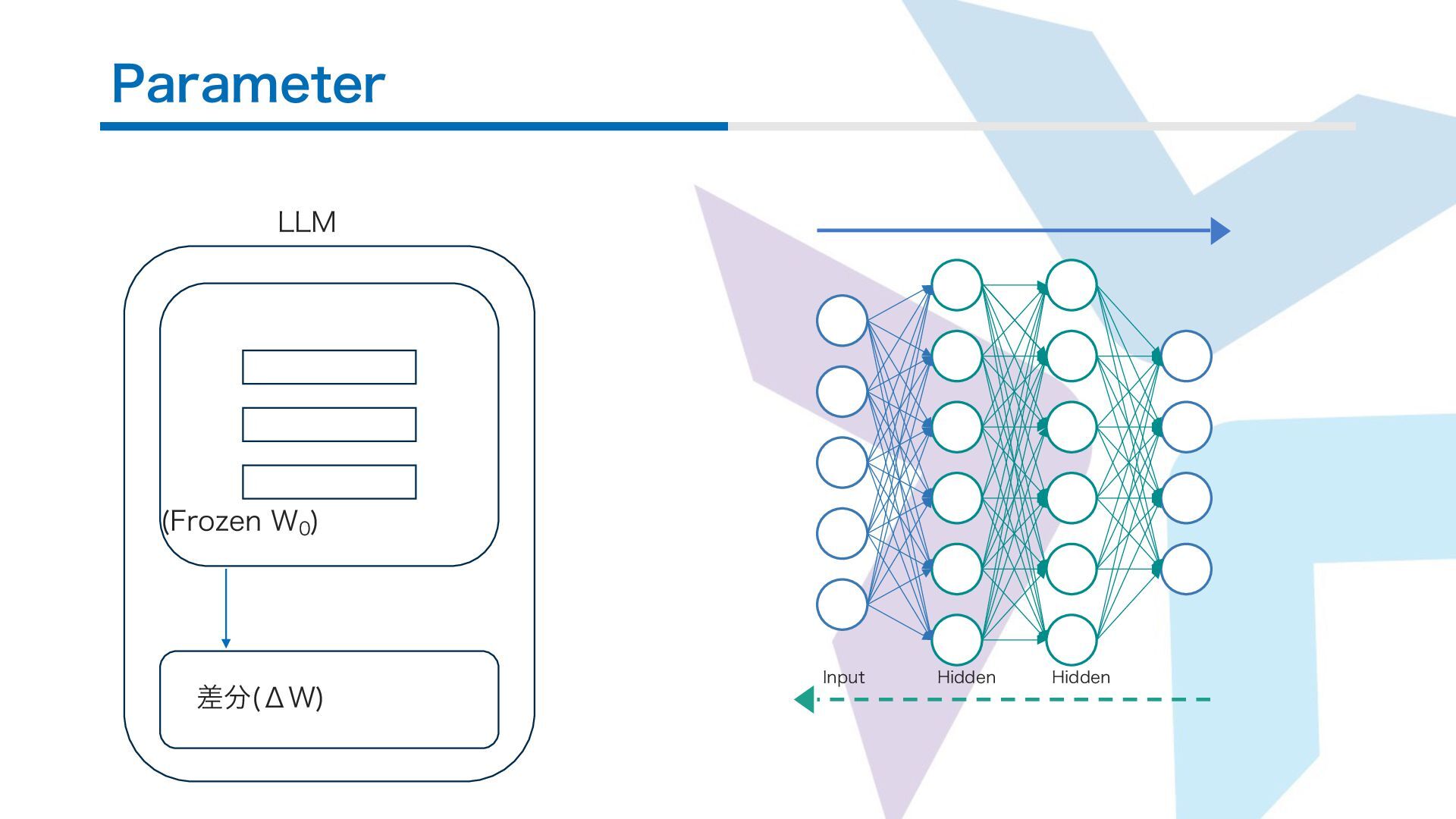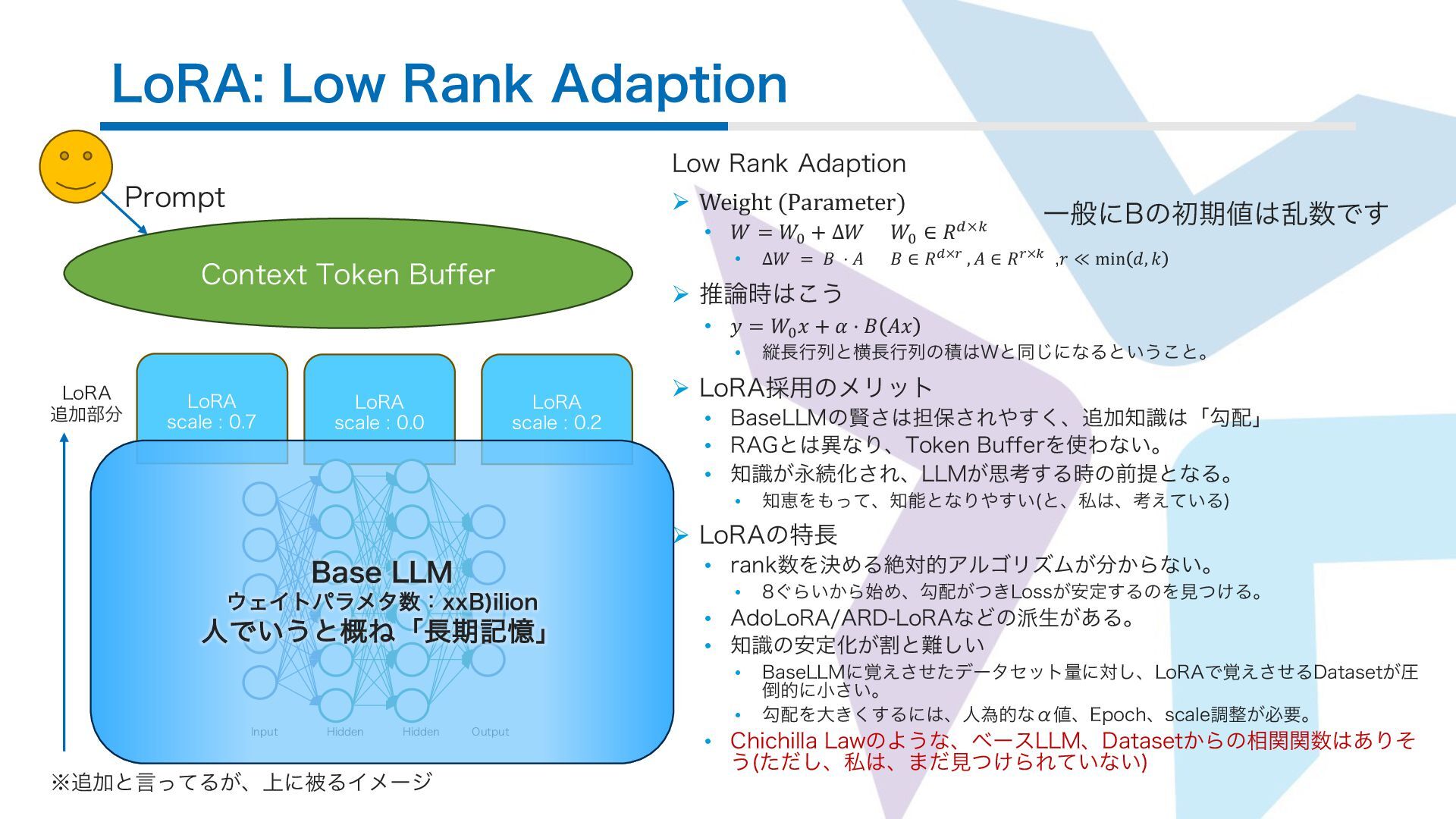 Δ𝑊 𝑊" ∈ 𝑅#×% • Δ𝑊 = 𝐵 ⋅ 𝐴 𝐵 ∈ 𝑅+×% , 𝐴 ∈ 𝑅%×- 𝑟 ≪ min 𝑑, 𝑘 Ø ਪ࿦࣌͸͜͏ • 𝑦 = 𝑊" 𝑥 + 𝛼 ⋅ 𝐵 𝐴𝑥 • ॎ௕ߦྻͱԣ௕ߦྻͷੵ͸8ͱಉ͡ʹͳΔͱ͍͏͜ͱɻ Ø -P3"࠾༻ͷϝϦοτ • #BTF--.ͷݡ͞͸୲อ͞Ε΍͘͢ɺ௥Ճ஌ࣝ͸ʮޯ഑ʯ • 3"(ͱ͸ҟͳΓɺ5PLFO #VGGFSΛ࢖Θͳ͍ɻ • ஌͕ࣝӬଓԽ͞Εɺ--.͕ࢥߟ͢Δ࣌ͷલఏͱͳΔɻ • ஌ܙΛ΋ͬͯɺ஌ೳͱͳΓ΍͍͢ ͱɺࢲ͸ɺߟ͍͑ͯΔ Ø -P3"ͷಛ௕ • SBOL਺ΛܾΊΔઈରతΞϧΰϦζϜ͕෼͔Βͳ͍ɻ • ͙Β͍͔Β࢝Ίɺޯ഑͕͖ͭ-PTT͕҆ఆ͢ΔͷΛݟ͚ͭΔɻ • "EP-P3""3%-P3"ͳͲͷ೿ੜ͕͋Δɻ • ஌ࣝͷ҆ఆԽׂ͕ͱ೉͍͠ • #BTF--.ʹ֮͑ͤͨ͞σʔληοτྔʹର͠ɺ-P3"Ͱ֮͑ͤ͞Δ%BUBTFU͕ѹ ౗తʹখ͍͞ɻ • ޯ഑Λେ͖͘͢Δʹ͸ɺਓҝతͳЋ஋ɺ&QPDIɺTDBMFௐ੔͕ඞཁɻ • $IJDIJMMB-BXͷΑ͏ͳɺϕʔε--.ɺ%BUBTFU͔Βͷ૬ؔؔ਺͸͋Γͦ ͏ ͨͩ͠ɺࢲ͸ɺ·ͩݟ͚ͭΒΕ͍ͯͳ͍ $POUFYU5PLFO#VGGFS 1SPNQU Ұൠʹ#ͷॳظ஋͸ཚ਺Ͱ͢ -P3" TDBMF -P3" TDBMF -P3" TDBMF -P3" ௥Ճ෦෼ *OQVU )JEEFO )JEEFO 0VUQVU #BTF--. ΢ΣΠτύϥϝλ਺ɿYY# JMJPO ਓͰ͍͏ͱ֓Ͷʮ௕ظهԱʯ ˞௥ՃͱݴͬͯΔ͕ɺ্ʹඃΔΠϝʔδ
