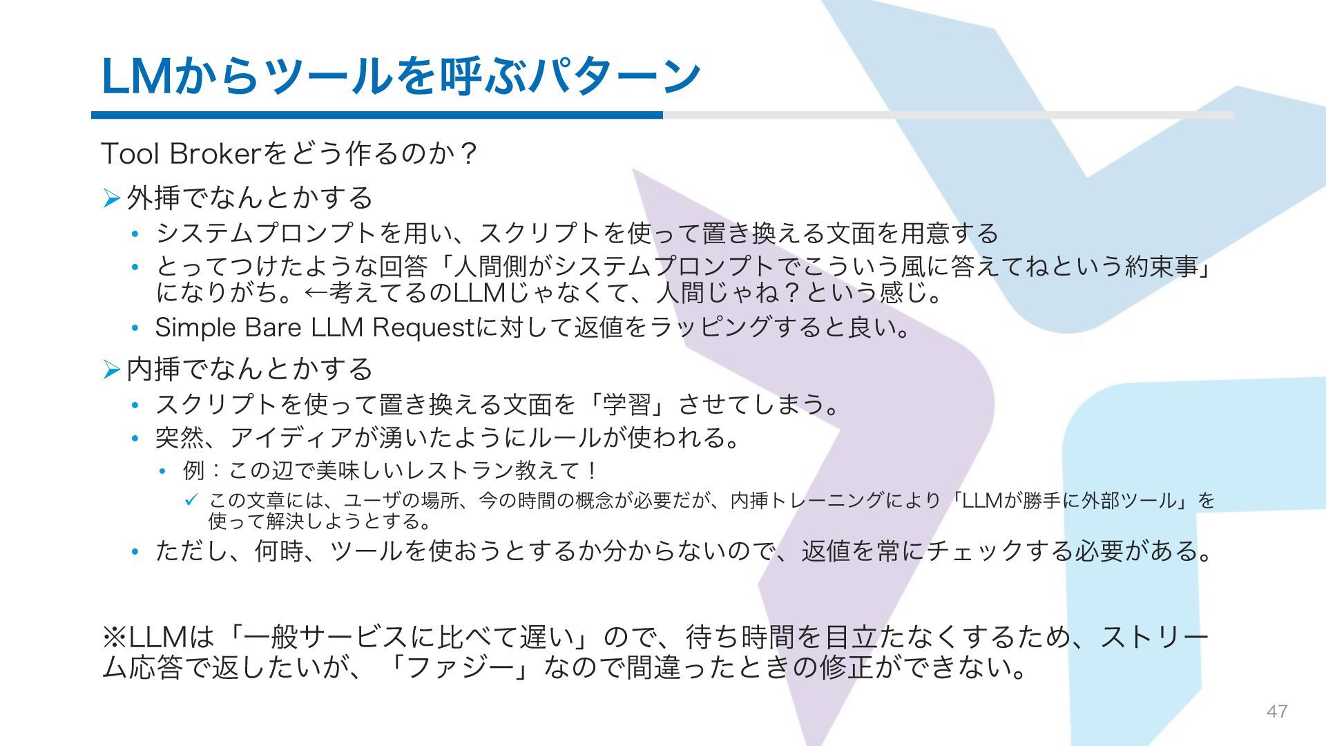 Ø಺ૠͰͳΜͱ͔͢Δ • εΫϦϓτΛ࢖ͬͯஔ͖׵͑Δจ໘Λʮֶशʯͤͯ͞͠·͏ɻ • ಥવɺΞΠσΟΞ͕༙͍ͨΑ͏ʹϧʔϧ͕࢖ΘΕΔɻ • ྫɿ͜ͷลͰඒຯ͍͠Ϩετϥϯڭ͑ͯʂ ü ͜ͷจষʹ͸ɺϢʔβͷ৔ॴɺࠓͷ࣌ؒͷ֓೦͕ඞཁ͕ͩɺ಺ૠτϨʔχϯάʹΑΓʮ--.͕উखʹ֎෦πʔϧʯΛ ࢖ͬͯղܾ͠Α͏ͱ͢Δɻ • ͨͩ͠ɺԿ࣌ɺπʔϧΛ࢖͓͏ͱ͢Δ͔෼͔Βͳ͍ͷͰɺฦ஋ΛৗʹνΣοΫ͢Δඞཁ͕͋Δɻ ˞--.͸ʮҰൠαʔϏεʹൺ΂ͯ஗͍ʯͷͰɺ଴ͪ࣌ؒΛ໨ཱͨͳ͘͢ΔͨΊɺετϦʔ ϜԠ౴Ͱฦ͍͕ͨ͠ɺʮϑΝδʔʯͳͷͰؒҧͬͨͱ͖ͷमਖ਼͕Ͱ͖ͳ͍ɻ