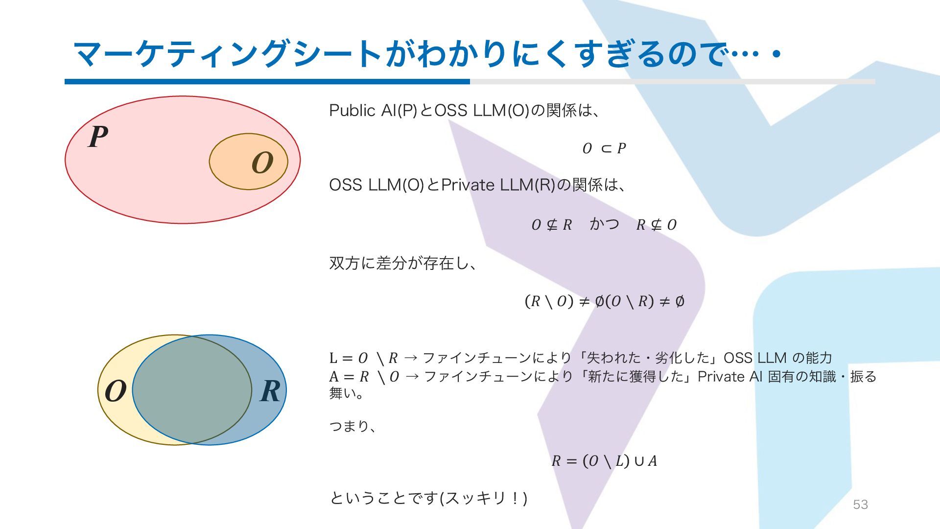 044--. 0 ͱ1SJWBUF--. 3 ͷؔ܎͸ɺ 𝑂 ⊈ 𝑅 ͔ͭ 𝑅 ⊈ 𝑂 ૒ํʹࠩ෼͕ଘࡏ͠ɺ 𝑅 ∖ 𝑂 ≠ ∅ 𝑂 ∖ 𝑅 ≠ ∅ L = 𝑂 ∖ 𝑅ˠϑΝΠϯνϡʔϯʹΑΓʮࣦΘΕͨɾྼԽͨ͠ʯ044--.ͷೳྗ A = 𝑅 ∖ 𝑂ˠϑΝΠϯνϡʔϯʹΑΓʮ৽ͨʹ֫ಘͨ͠ʯ1SJWBUF"*ݻ༗ͷ஌ࣝɾৼΔ ෣͍ɻ ͭ·Γɺ 𝑅 = 𝑂 ∖ 𝐿 ∪ 𝐴 ͱ͍͏͜ͱͰ͢ εοΩϦʂ R P O O