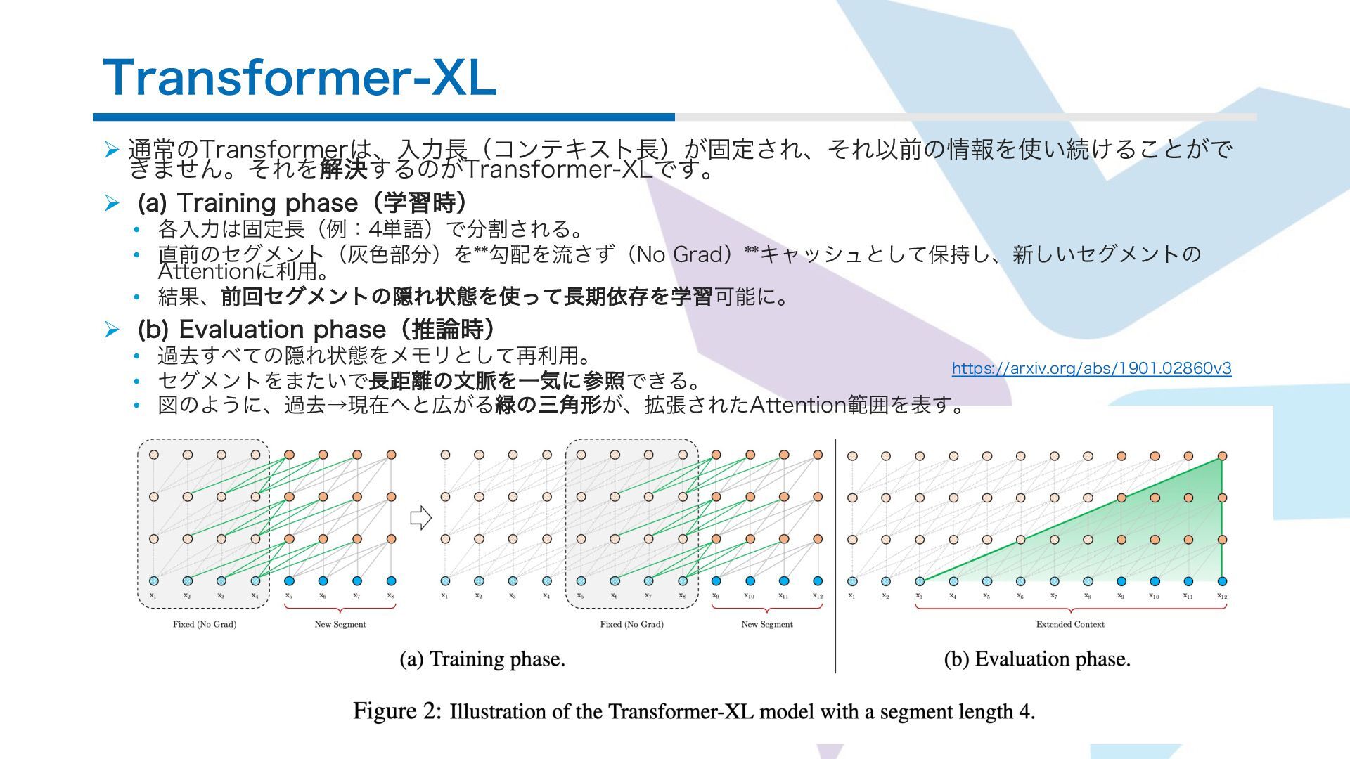 37. 5SBOTGPSNFS9- Ø ௨ৗͷ5SBOTGPSNFS͸ɺೖྗ௕ʢίϯςΩετ௕ʣ͕ݻఆ͞ΕɺͦΕҎલͷ৘ใΛ࢖͍ଓ͚Δ͜ͱ͕Ͱ ͖·ͤΜɻͦΕΛղܾ͢Δͷ͕5SBOTGPSNFS9-Ͱ͢ɻ Ø  B 5SBJOJOHQIBTFʢֶश࣌ʣ • ֤ೖྗ͸ݻఆ௕ʢྫɿ୯ޠʣͰ෼ׂ͞ΕΔɻ