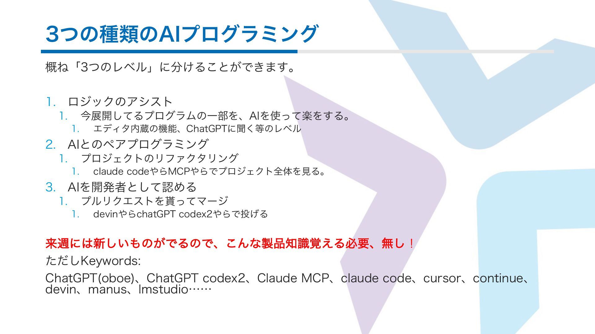40. ͭͷछྨͷ"*ϓϩάϥϛϯά ֓ͶʮͭͷϨϕϧʯʹ෼͚Δ͜ͱ͕Ͱ͖·͢ɻ  ϩδοΫͷΞγετ  ࠓల։ͯ͠ΔϓϩάϥϜͷҰ෦Λɺ"*Λ࢖ָͬͯΛ͢Δɻ  ΤσΟλ಺ଂͷػೳɺ$IBU(15ʹฉ͘౳ͷϨϕϧ  "*ͱͷϖΞϓϩάϥϛϯά