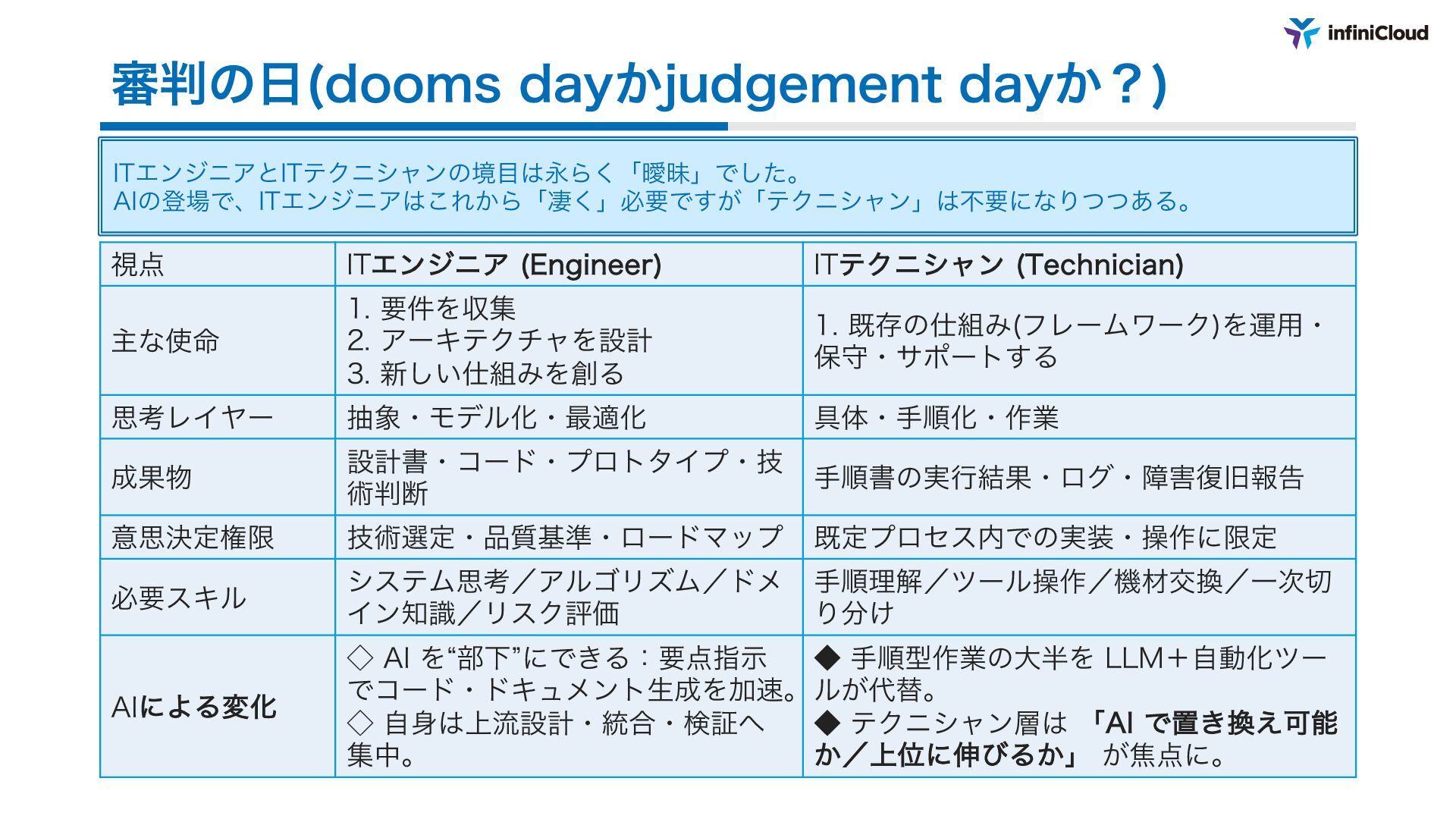 42. ৹൑ͷ೔ EPPNTEBZ͔KVEHFNFOUEBZ͔ʁ *5ΤϯδχΞͱ*5ςΫχγϟϯͷڥ໨͸ӬΒ͘ʮᐆດʯͰͨ͠ɻ "*ͷొ৔Ͱɺ*5ΤϯδχΞ͸͜Ε͔Βʮੌ͘ʯඞཁͰ͕͢ʮςΫχγϟϯʯ͸ෆཁʹͳΓͭͭ͋Δɻ ࢹ఺ *5ΤϯδχΞ &OHJOFFS *5ςΫχγϟϯ 5FDIOJDJBO ओͳ࢖໋