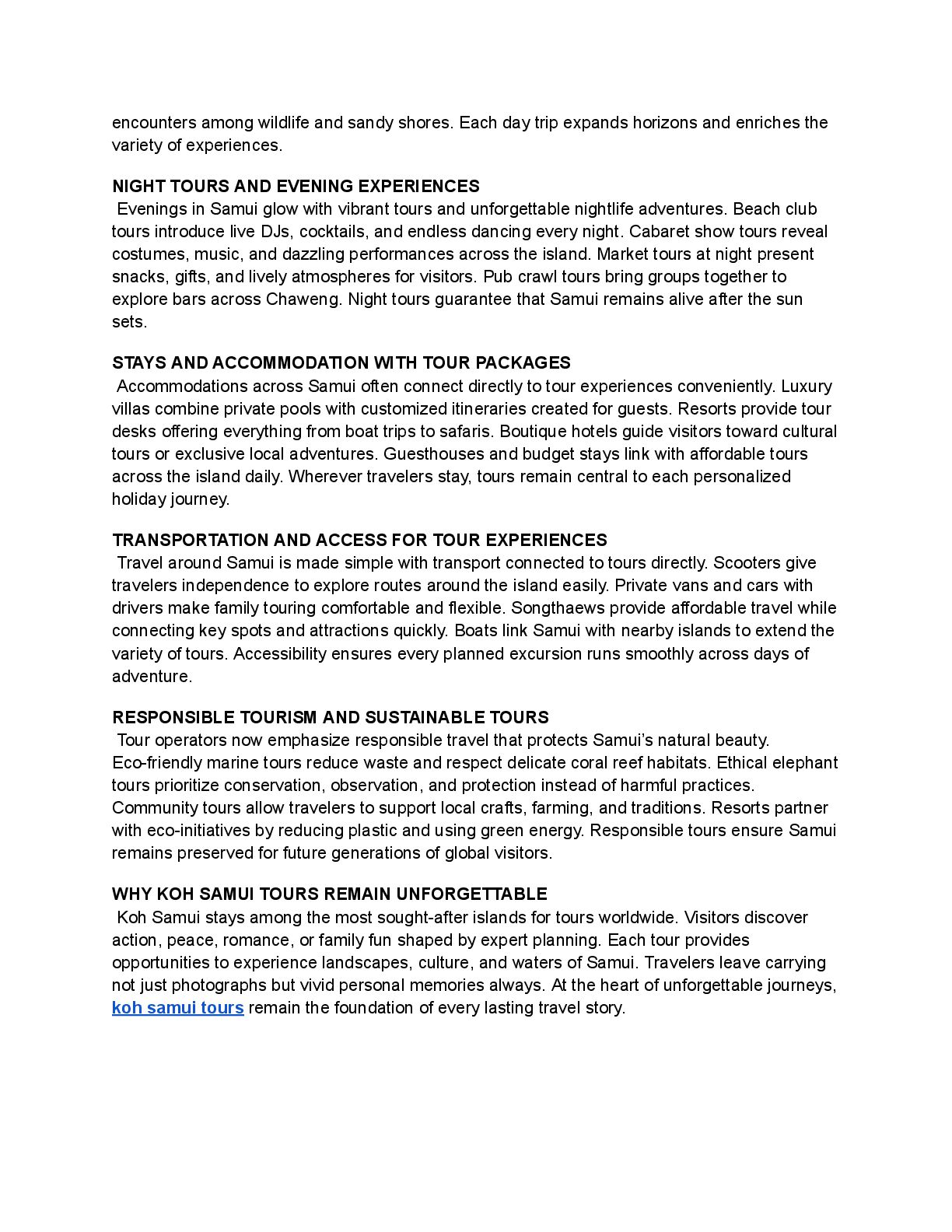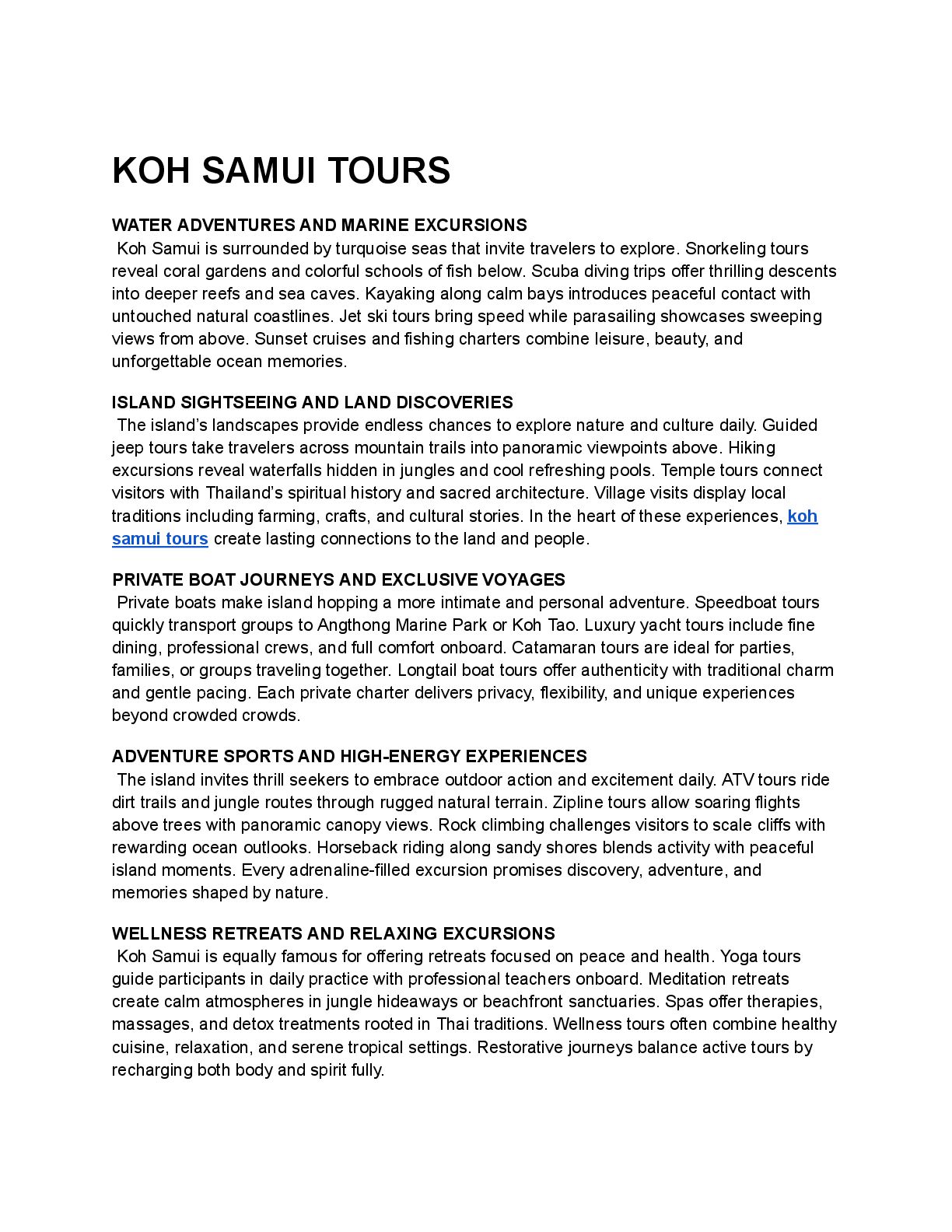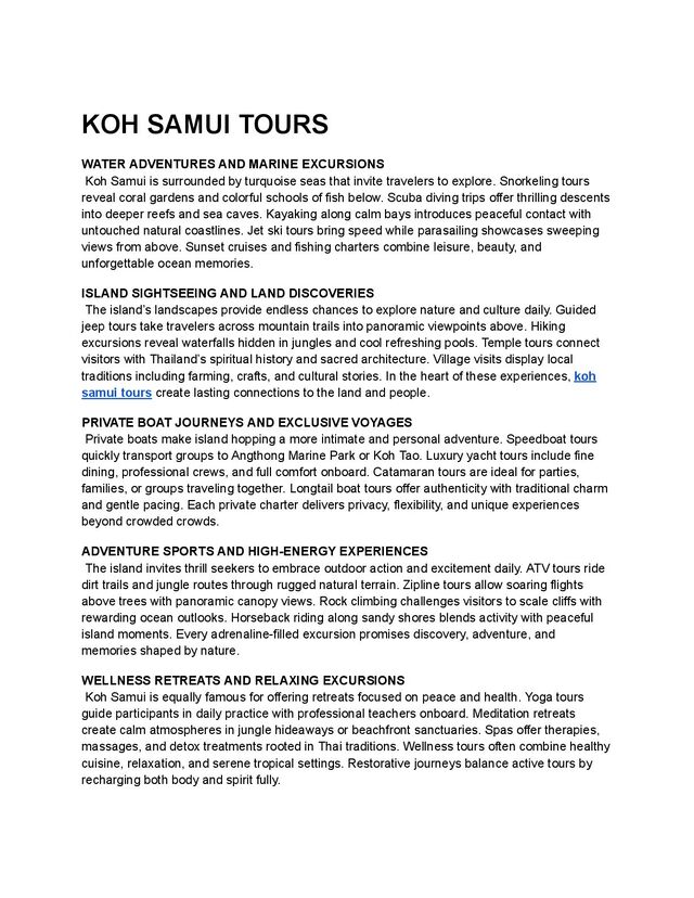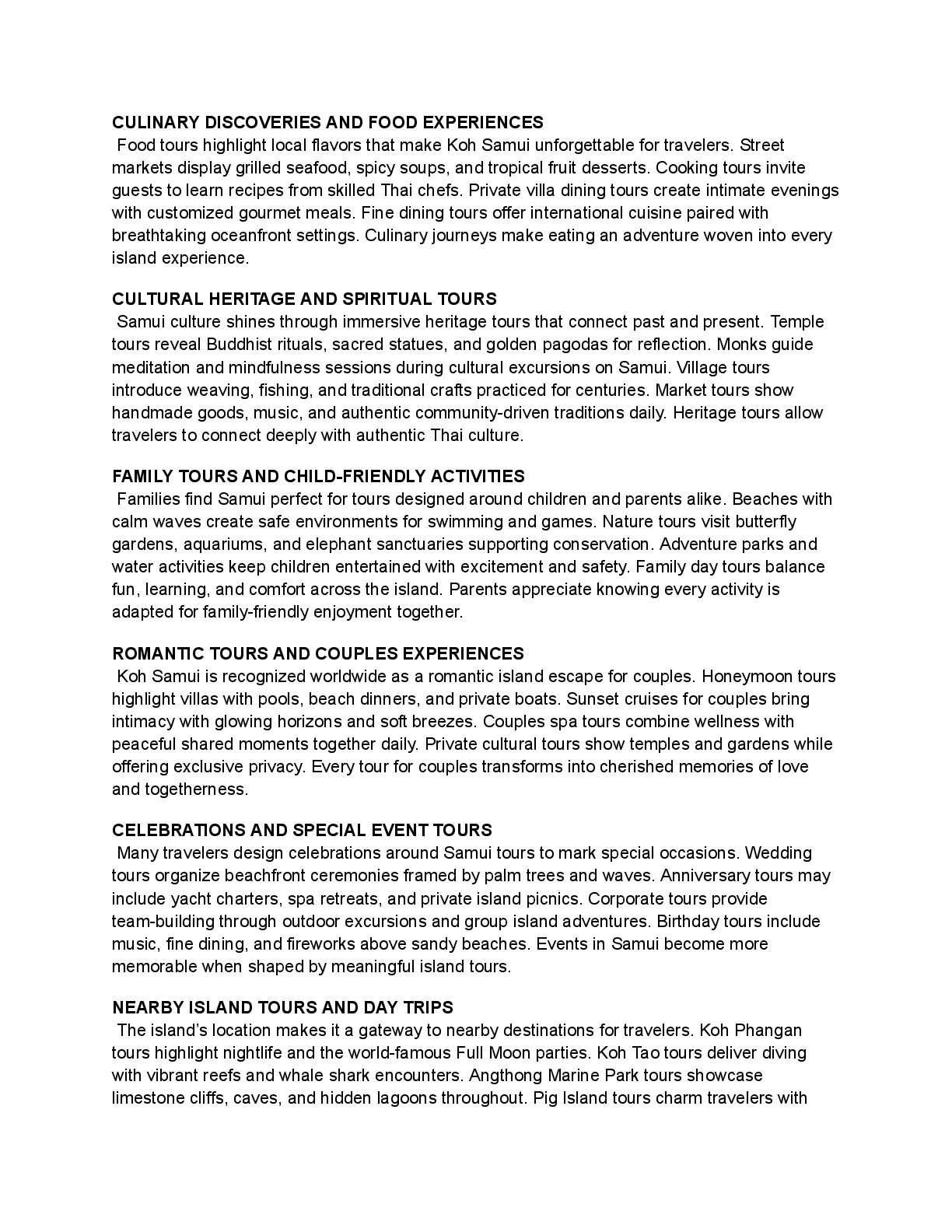 that make Koh Samui unforgettable for travelers. Street markets display grilled seafood, spicy soups, and tropical fruit desserts. Cooking tours invite guests to learn recipes from skilled Thai chefs. Private villa dining tours create intimate evenings with customized gourmet meals. Fine dining tours offer international cuisine paired with breathtaking oceanfront settings. Culinary journeys make eating an adventure woven into every island experience. CULTURAL HERITAGE AND SPIRITUAL TOURS Samui culture shines through immersive heritage tours that connect past and present. Temple tours reveal Buddhist rituals, sacred statues, and golden pagodas for reflection. Monks guide meditation and mindfulness sessions during cultural excursions on Samui. Village tours introduce weaving, fishing, and traditional crafts practiced for centuries. Market tours show handmade goods, music, and authentic community-driven traditions daily. Heritage tours allow travelers to connect deeply with authentic Thai culture. FAMILY TOURS AND CHILD-FRIENDLY ACTIVITIES Families find Samui perfect for tours designed around children and parents alike. Beaches with calm waves create safe environments for swimming and games. Nature tours visit butterfly gardens, aquariums, and elephant sanctuaries supporting conservation. Adventure parks and water activities keep children entertained with excitement and safety. Family day tours balance fun, learning, and comfort across the island. Parents appreciate knowing every activity is adapted for family-friendly enjoyment together. ROMANTIC TOURS AND COUPLES EXPERIENCES Koh Samui is recognized worldwide as a romantic island escape for couples. Honeymoon tours highlight villas with pools, beach dinners, and private boats. Sunset cruises for couples bring intimacy with glowing horizons and soft breezes. Couples spa tours combine wellness with peaceful shared moments together daily. Private cultural tours show temples and gardens while offering exclusive privacy. Every tour for couples transforms into cherished memories of love and togetherness. CELEBRATIONS AND SPECIAL EVENT TOURS Many travelers design celebrations around Samui tours to mark special occasions. Wedding tours organize beachfront ceremonies framed by palm trees and waves. Anniversary tours may include yacht charters, spa retreats, and private island picnics. Corporate tours provide team-building through outdoor excursions and group island adventures. Birthday tours include music, fine dining, and fireworks above sandy beaches. Events in Samui become more memorable when shaped by meaningful island tours. NEARBY ISLAND TOURS AND DAY TRIPS The island’s location makes it a gateway to nearby destinations for travelers. Koh Phangan tours highlight nightlife and the world-famous Full Moon parties. Koh Tao tours deliver diving with vibrant reefs and whale shark encounters. Angthong Marine Park tours showcase limestone cliffs, caves, and hidden lagoons throughout. Pig Island tours charm travelers with