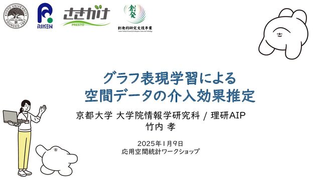 新国立劇場の避難シミュレータから生成したデータを用いた実験から介入効果推定 の精度向上を確認 26 劇場からの避難誘導の有無とドアの開閉選択 を介入とし2^7通りの組み合せの介入を想定 新国立劇場大ホールのシミュレーション例 ①共変量から空間特徴量を抽出 ②ドメイン適応法により 介入選択バイアスを除去 ③空間特徴量と 介入から結果を予測 Spatial Convolutional Counter Factual Regression Koh Takeuchi, Ryo Nishida, Hisashi Kashima, Masaki Onishi. ” Grab the reins of crowds: Estimating the effects of crowd movement guidance using causal inference. ” Proceedings of the 20th International Conference on Autonomous Agents and MultiAgent Systems (AAMAS), 2021.