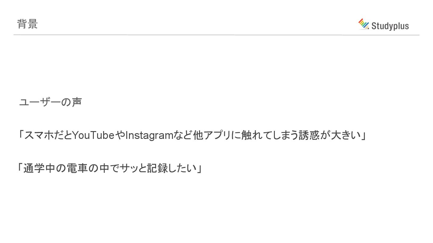 背景 ユーザーの声 「スマホだとYouTubeやInstagramなど他アプリに触れてしまう誘惑が大きい」 「通学中の電車の中でサッと記録したい」