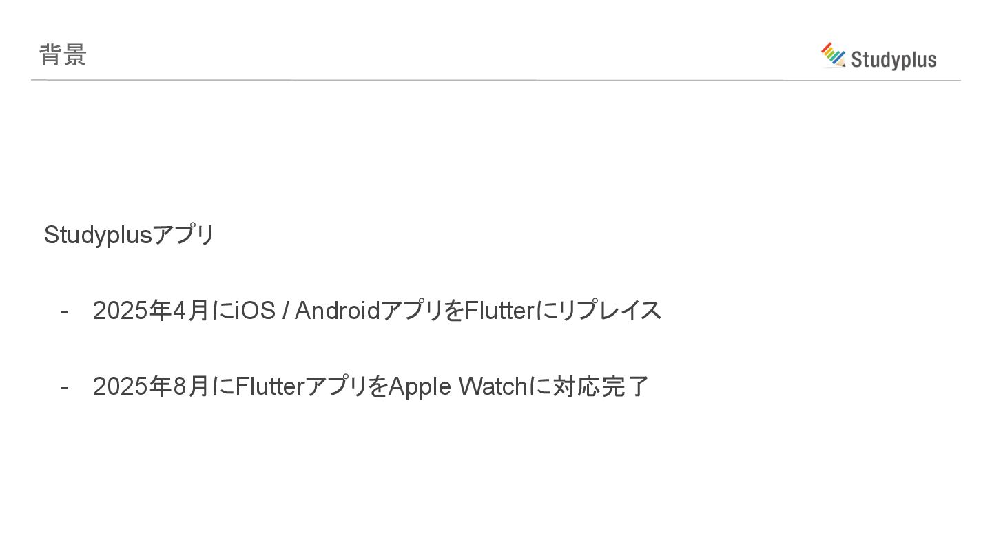 背景 Studyplusアプリ - 2025年4月にiOS / AndroidアプリをFlutterにリプレイス - 2025年8月にFlutterアプリをApple Watchに対応完了