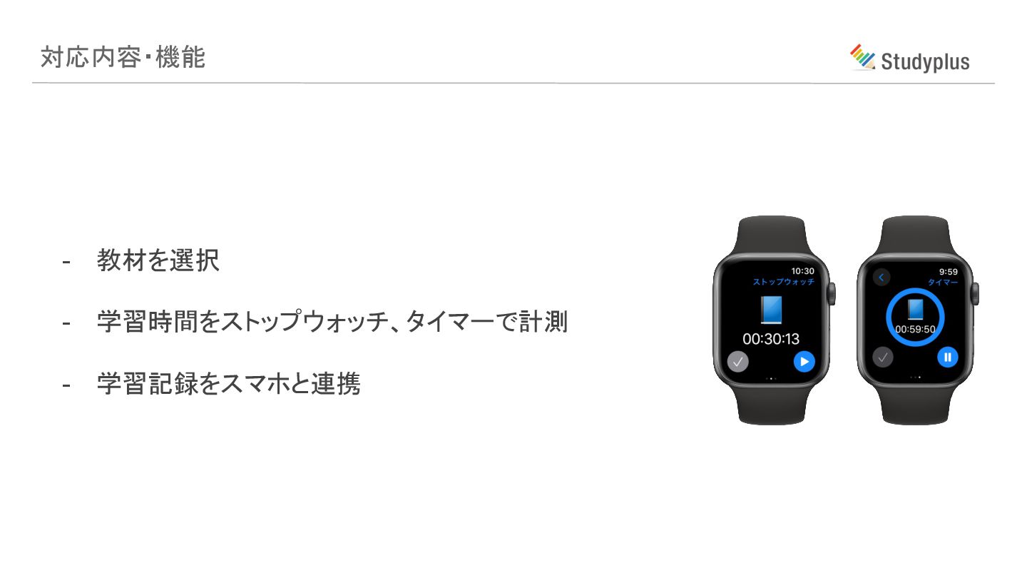 - 教材を選択 - 学習時間をストップウォッチ、タイマーで計測 - 学習記録をスマホと連携 対応内容・機能