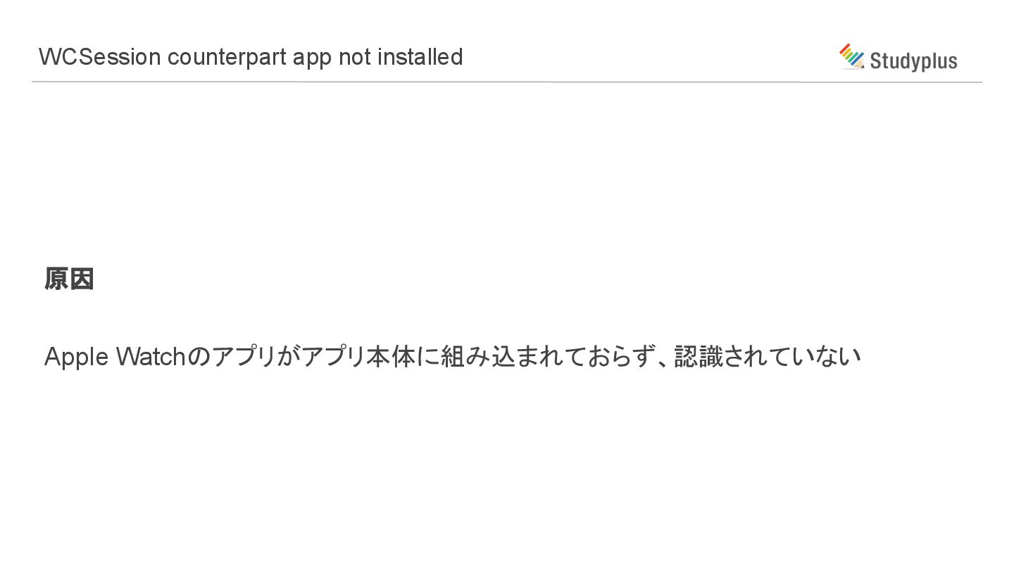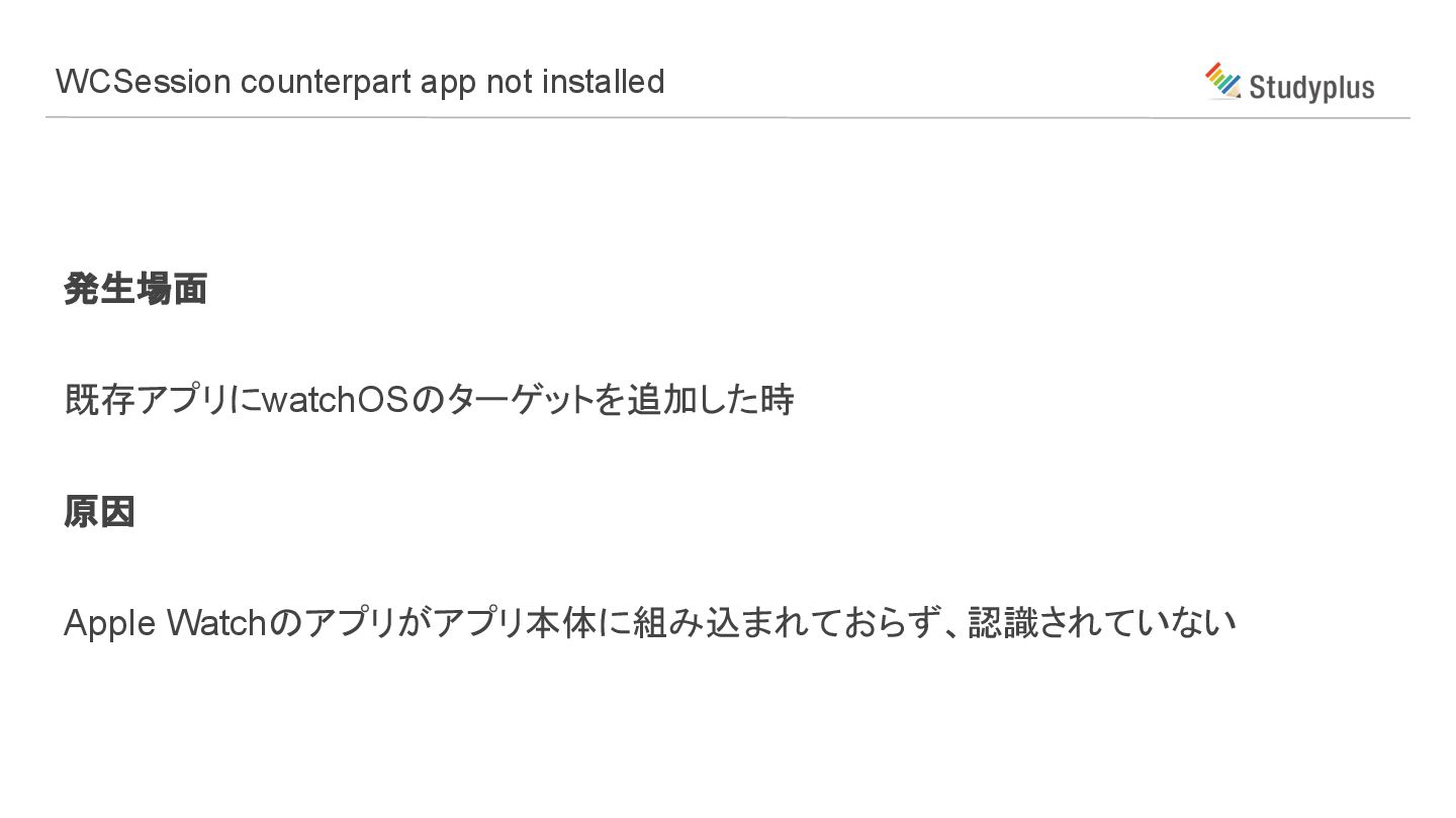 WCSession counterpart app not installed 発生場面 既存アプリにwatchOSのターゲットを追加した時 原因 Apple Watchのアプリがアプリ本体に組み込まれておらず、認識されていない