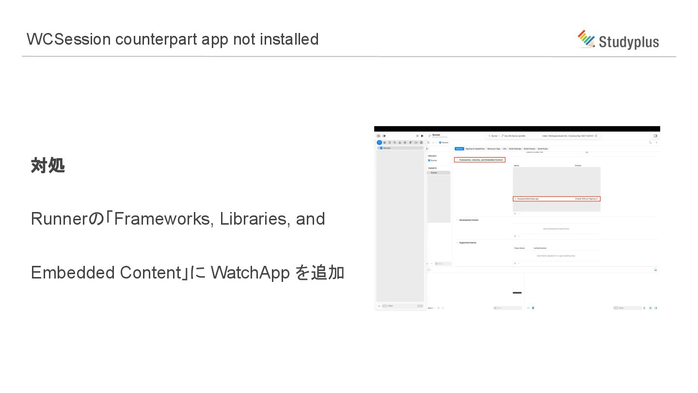 対処 Runnerの「Frameworks, Libraries, and Embedded Content」に WatchApp を追加 WCSession counterpart