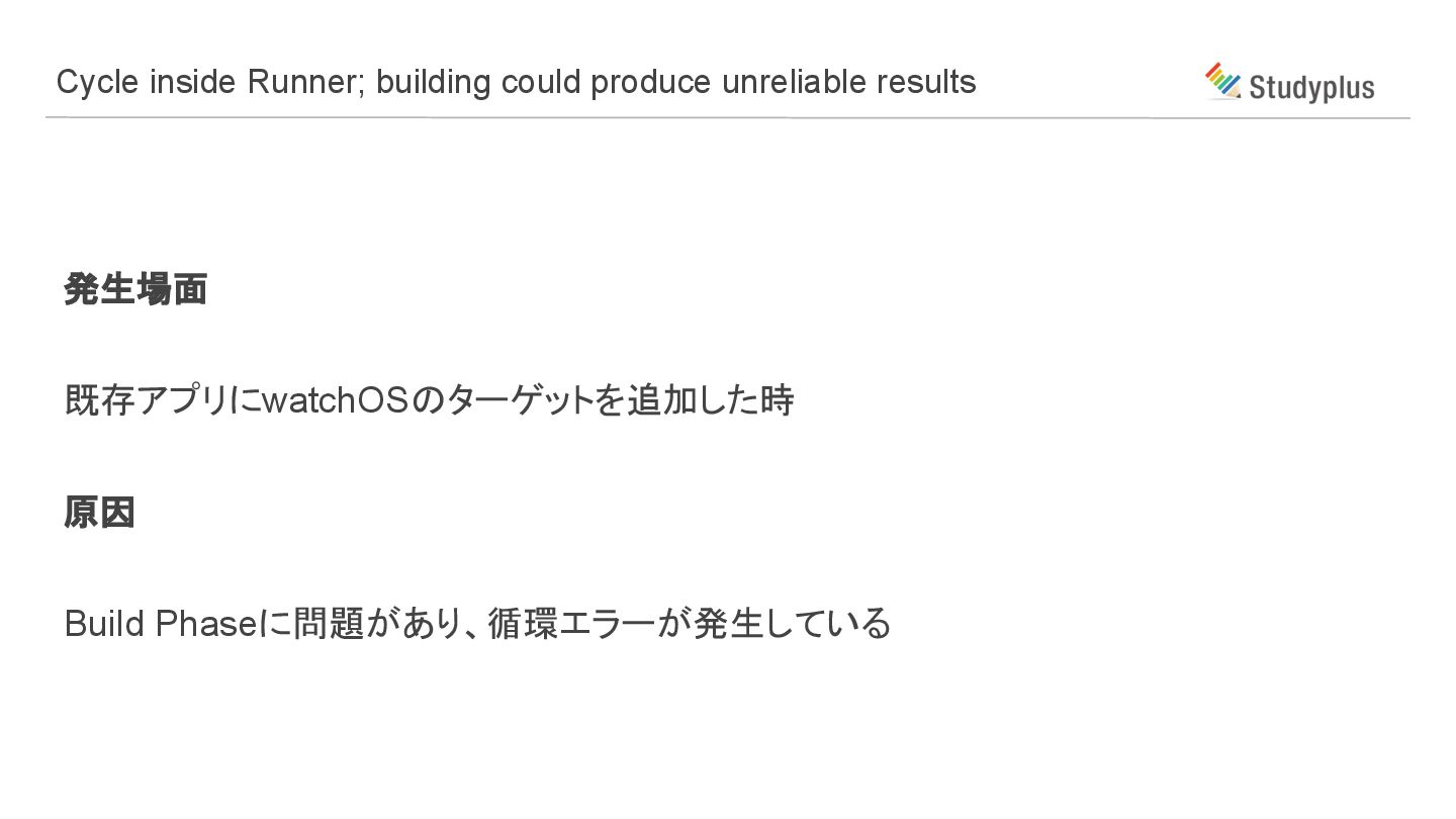 発生場面 既存アプリにwatchOSのターゲットを追加した時 原因 Build Phaseに問題があり、循環エラーが発生している Cycle inside Runner; building could