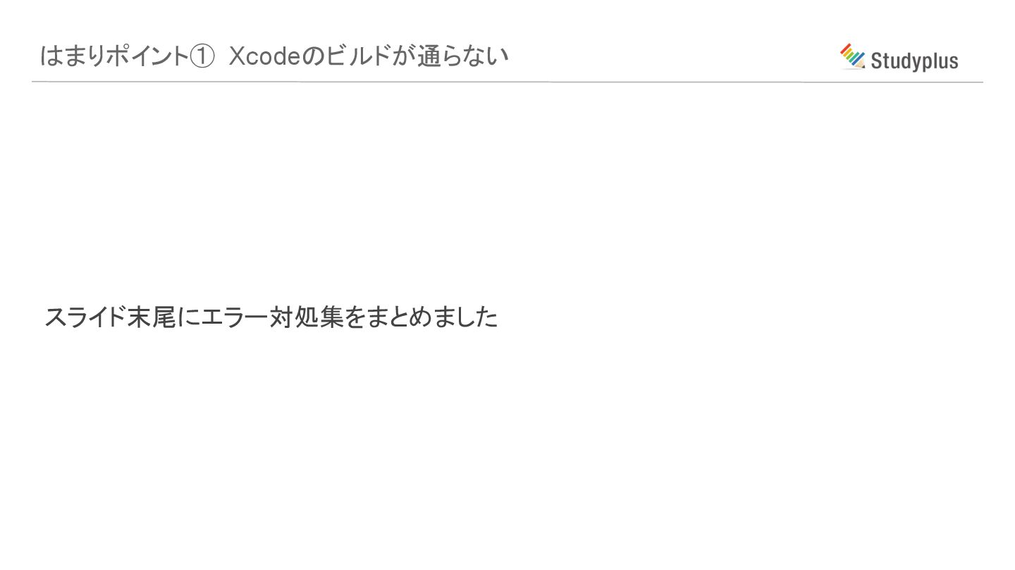 はまりポイント① Xcodeのビルドが通らない スライド末尾にエラー対処集をまとめました