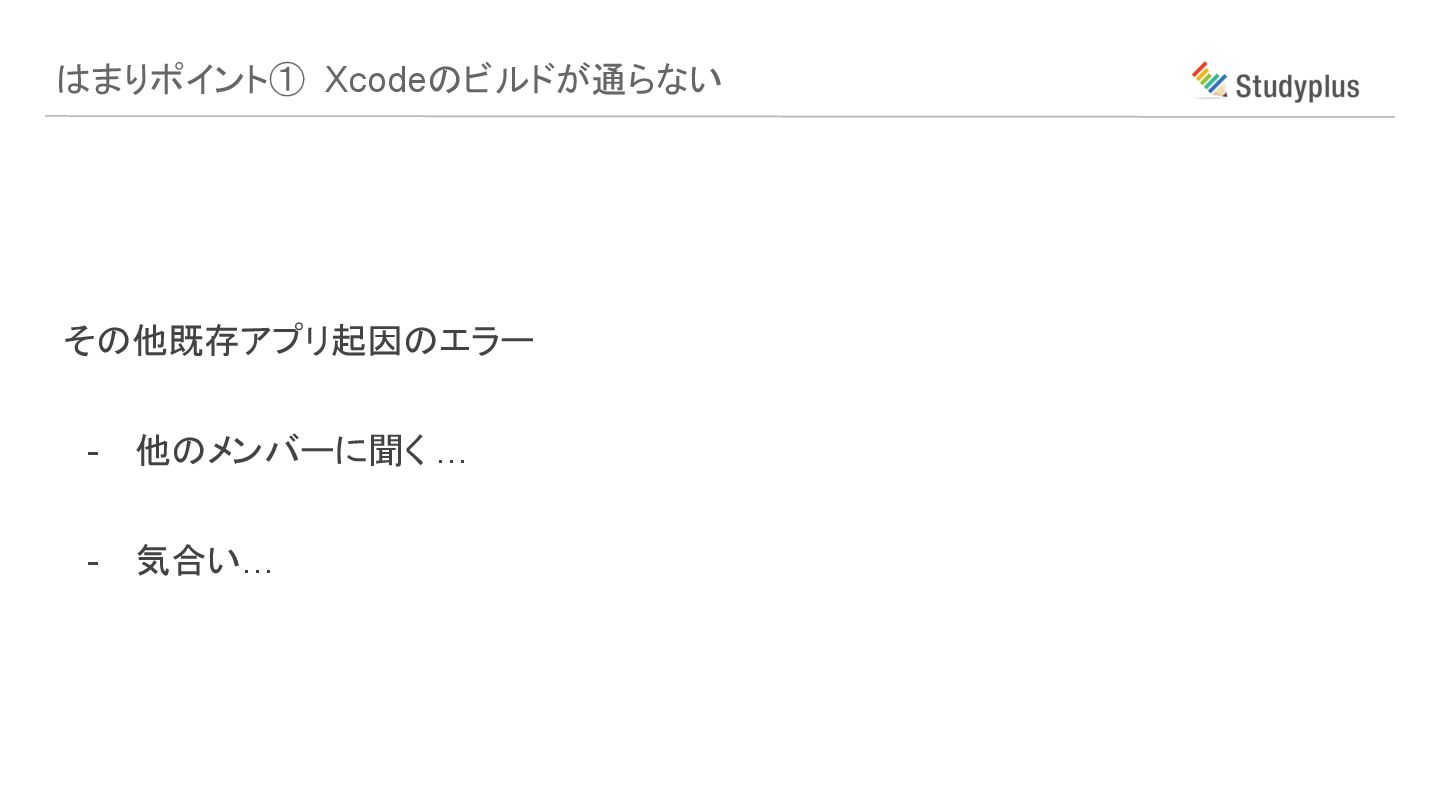はまりポイント① Xcodeのビルドが通らない その他既存アプリ起因のエラー - 他のメンバーに聞く … - 気合い…