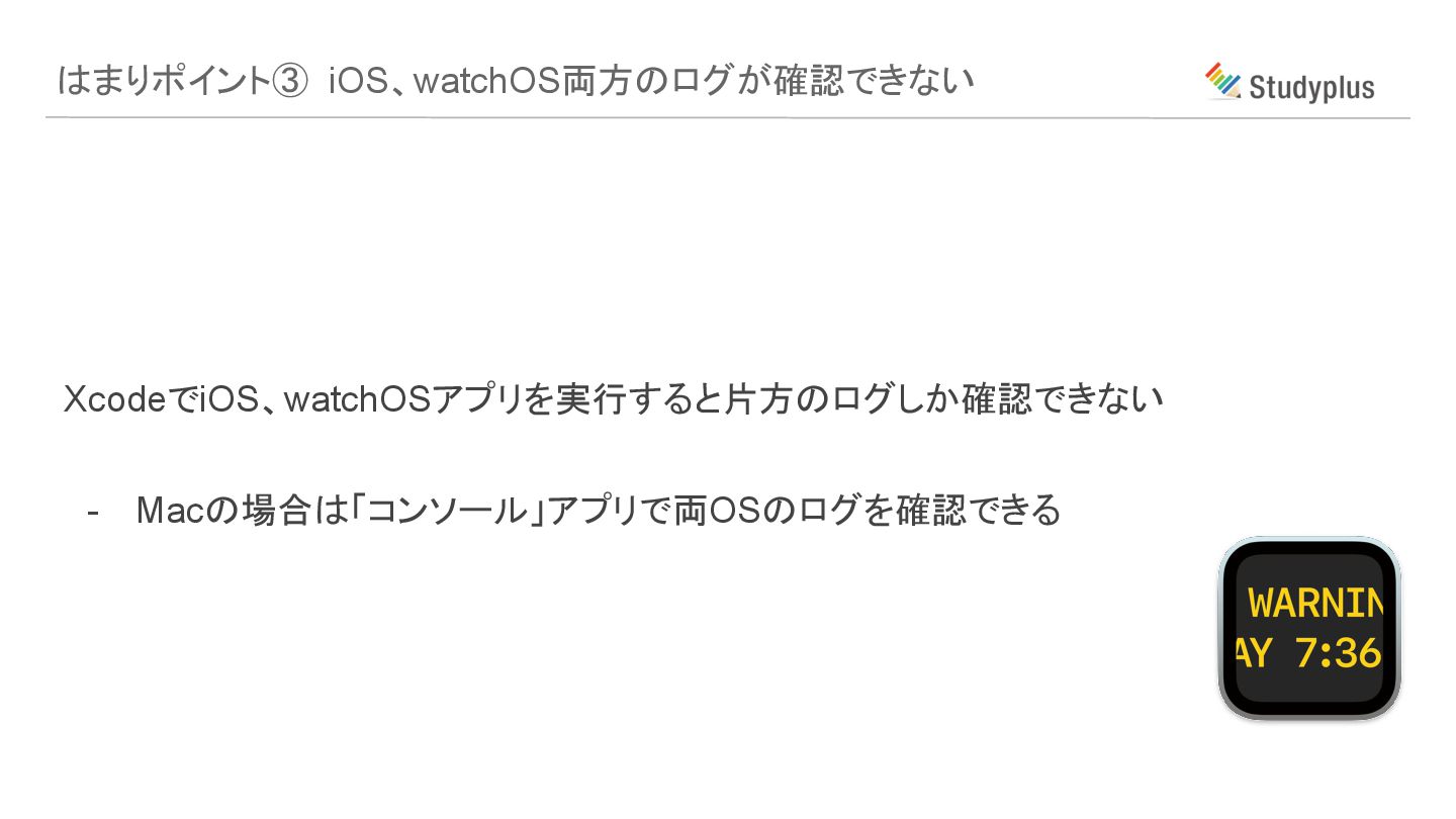はまりポイント③ iOS、watchOS両方のログが確認できない XcodeでiOS、watchOSアプリを実行すると片方のログしか確認できない - Macの場合は「コンソール」アプリで両OSのログを確認できる