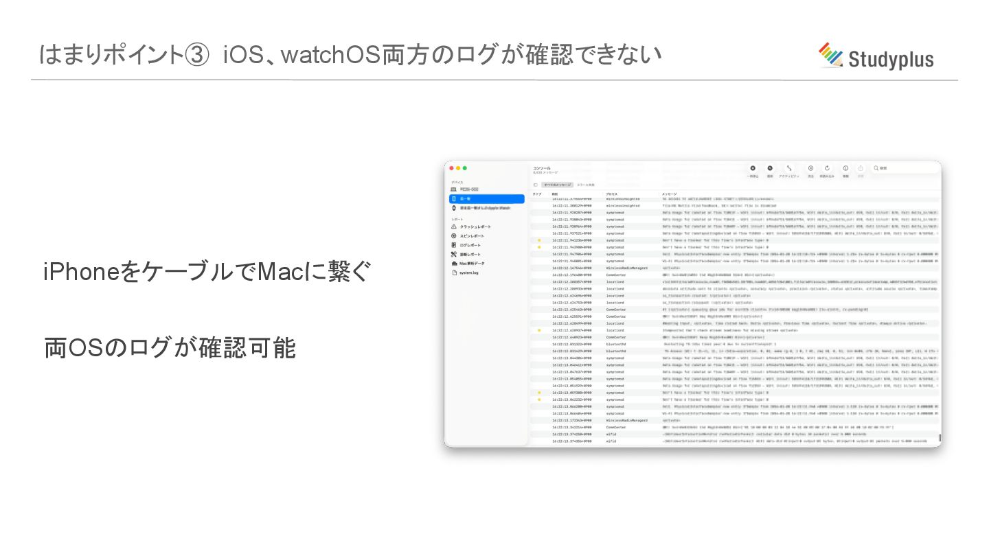 iPhoneをケーブルでMacに繋ぐ 両OSのログが確認可能 はまりポイント③ iOS、watchOS両方のログが確認できない