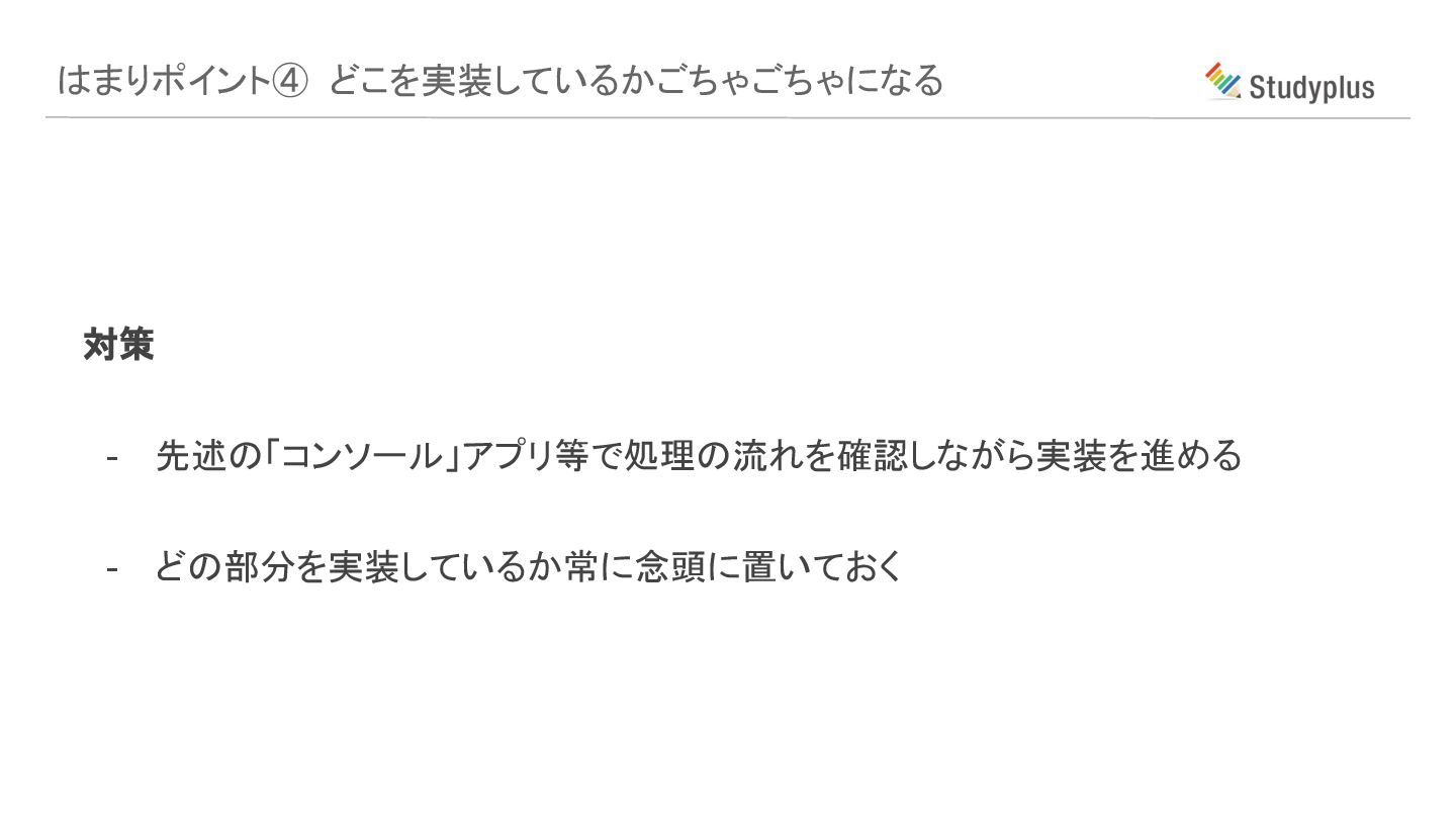 はまりポイント④ どこを実装しているかごちゃごちゃになる 対策 - 先述の「コンソール」アプリ等で処理の流れを確認しながら実装を進める - どの部分を実装しているか常に念頭に置いておく