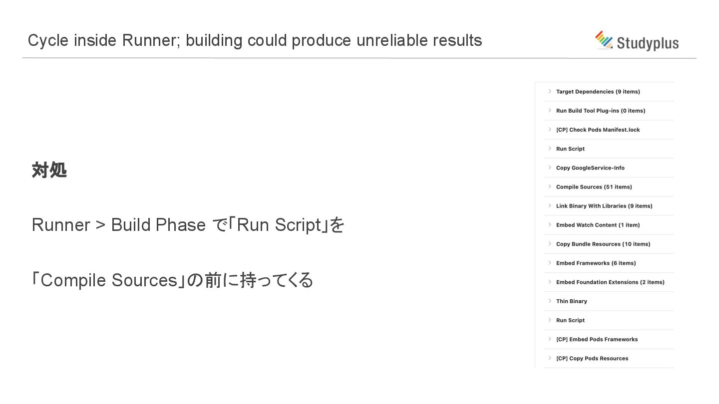 原因 Build Phaseに問題があり、循環エラーが発生している Cycle inside Runner; building could produce unreliable