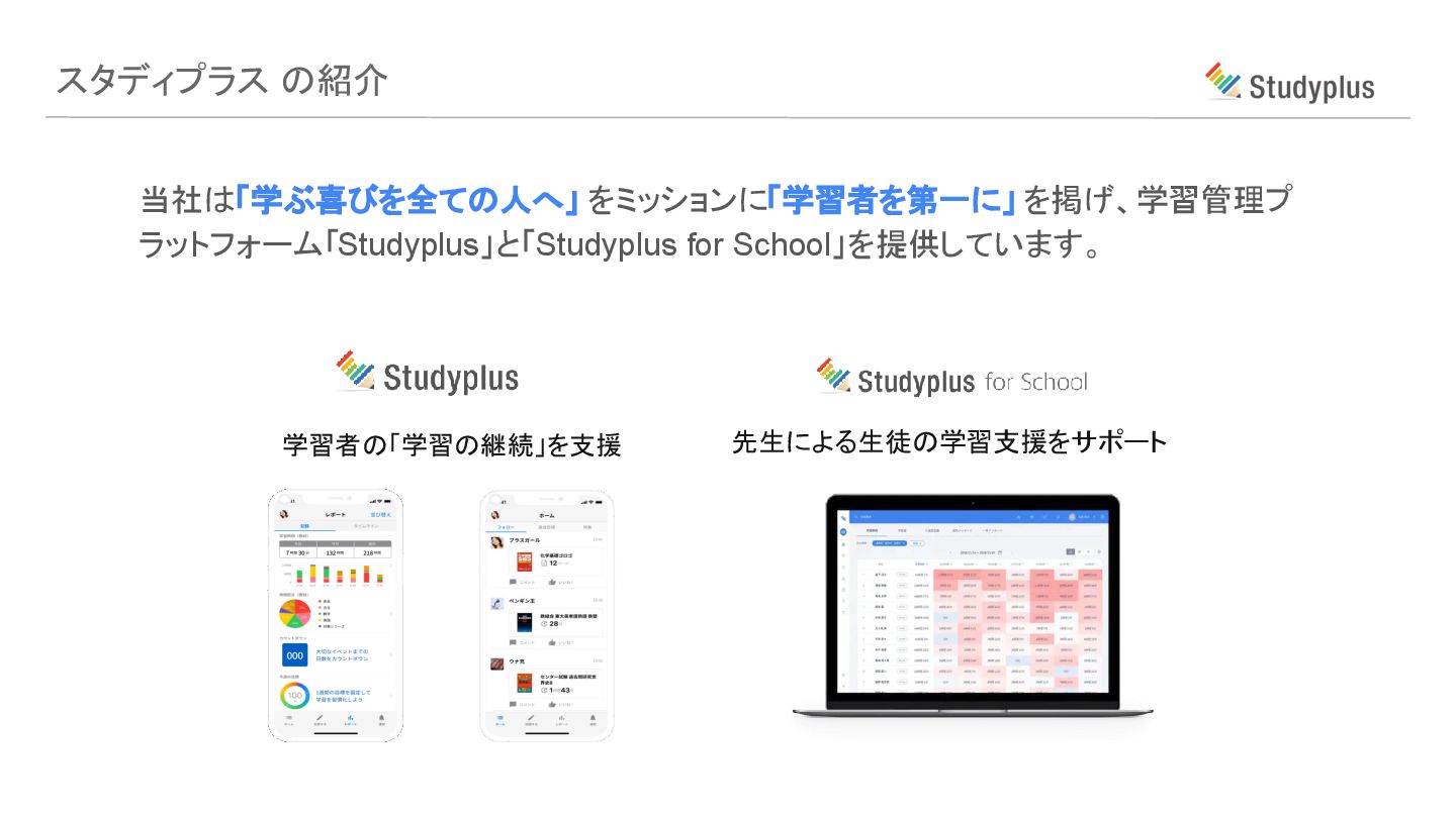 スタディプラス の紹介 当社は「学ぶ喜びを全ての人へ」 をミッションに「学習者を第一に」 を掲げ、学習管理プ ラットフォーム「Studyplus」と「Studyplus for School」を提供しています。 先生による生徒の学習支援をサポート 学習者の「学習の継続」を支援