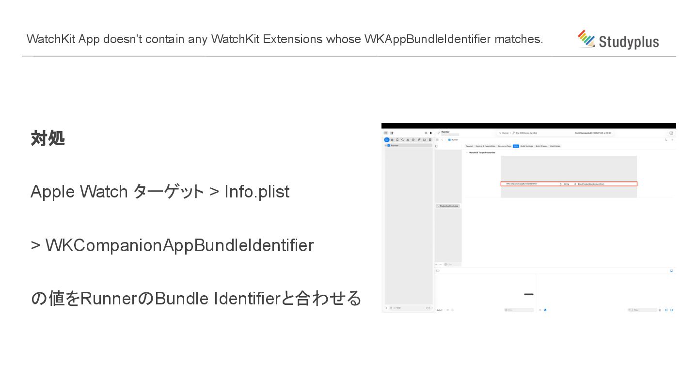 対処 Apple Watch ターゲット > Info.plist > WKCompanionAppBundleldentifier の値をRunnerのBundle Identifierと合わせる