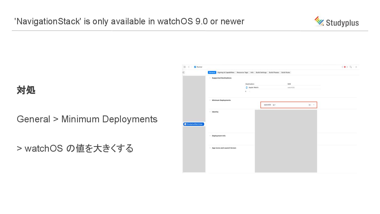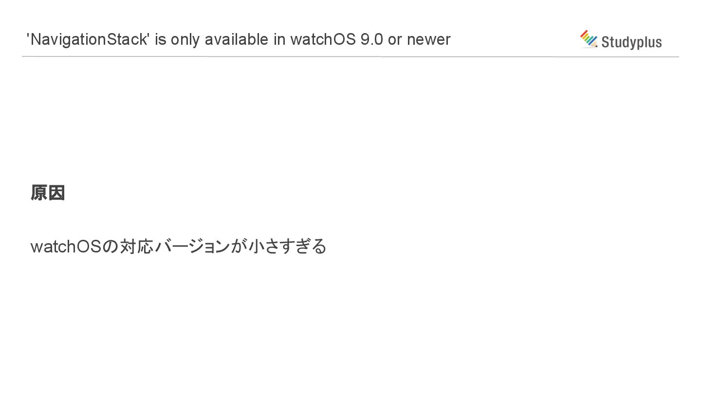 原因 watchOSの対応バージョンが小さすぎる 'NavigationStack' is only available in watchOS 9.0 or
