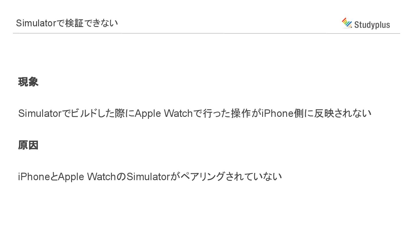 現象 Simulatorでビルドした際にApple Watchで行った操作がiPhone側に反映されない 原因 iPhoneとApple WatchのSimulatorがペアリングされていない Simulatorで検証できない