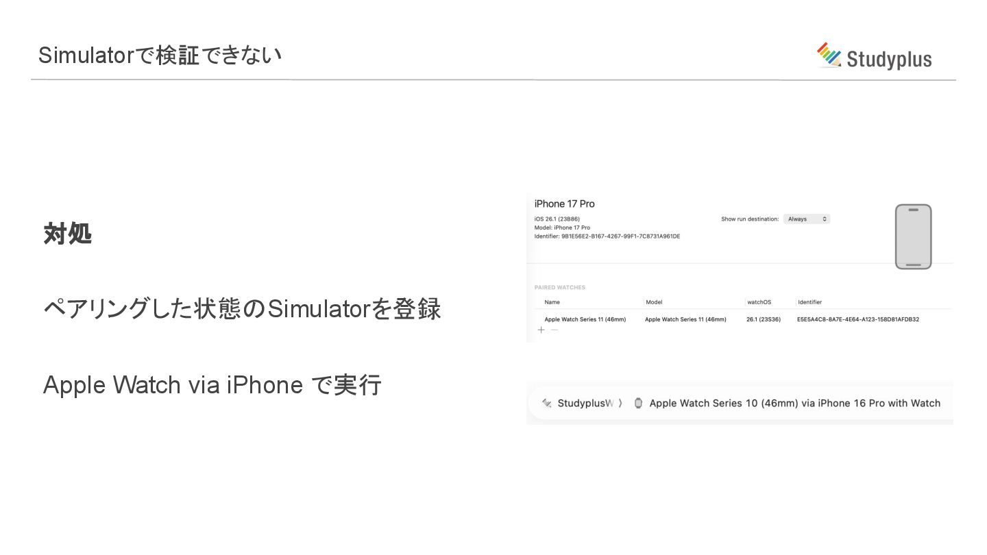 対処 ペアリングした状態のSimulatorを登録 Apple Watch via iPhone で実行 Simulatorで検証できない