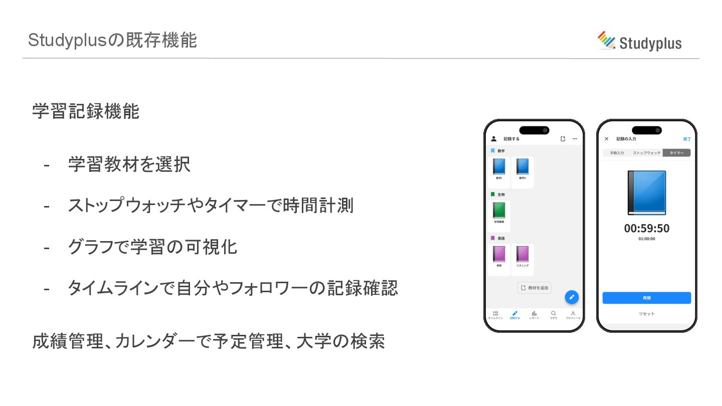 学習記録機能 - 学習教材を選択 - ストップウォッチやタイマーで時間計測 - グラフで学習の可視化 - タイムラインで自分やフォロワーの記録確認 成績管理、カレンダーで予定管理、大学の検索