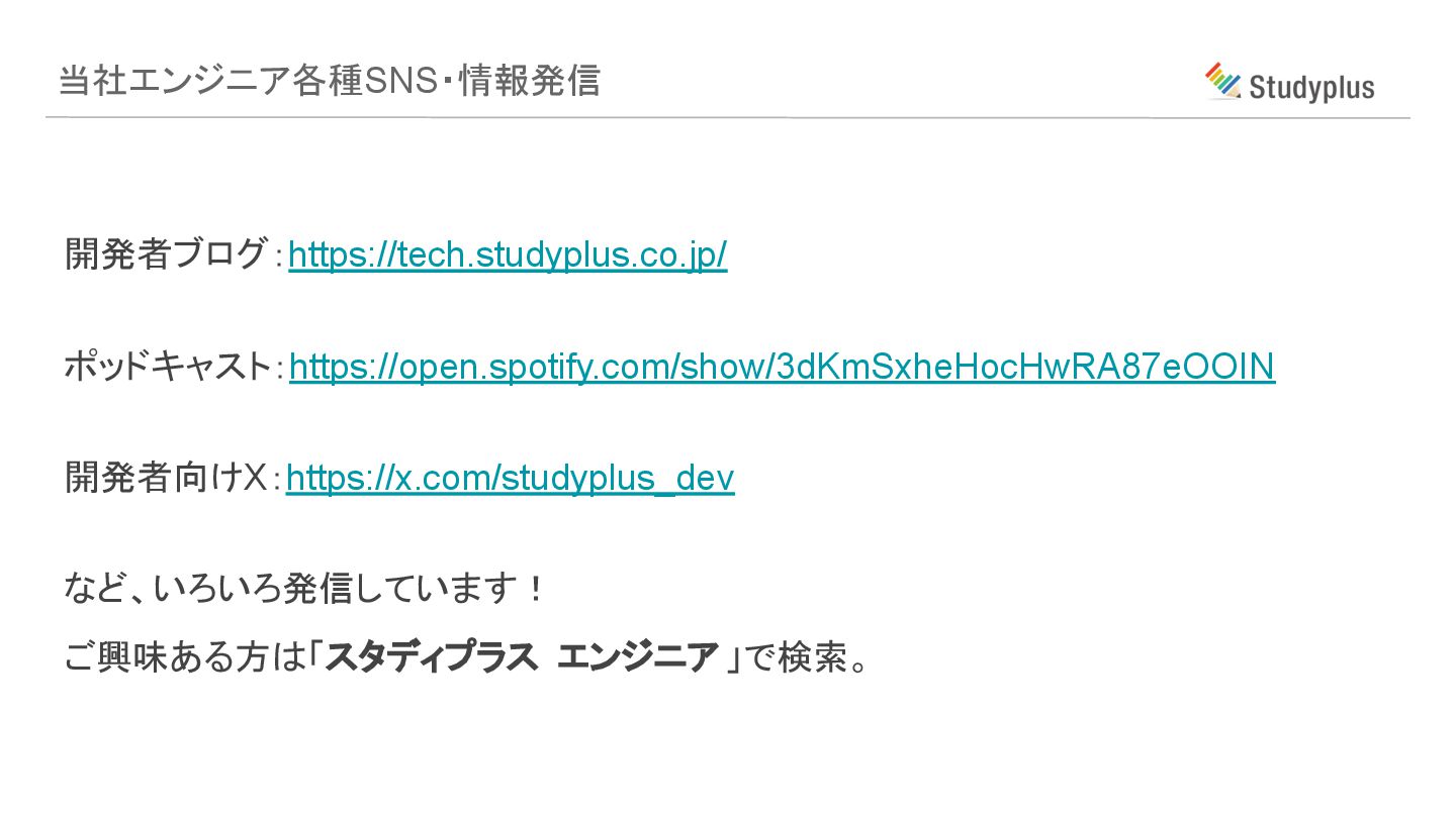 開発者ブログ:https://tech.studyplus.co.jp/ ポッドキャスト:https://open.spotify.com/show/3dKmSxheHocHwRA87eOOIN 開発者向けX:https://x.com/studyplus_dev など、いろいろ発信しています! ご興味ある方は「スタディプラス エンジニア 」で検索。 当社エンジニア各種SNS・情報発信