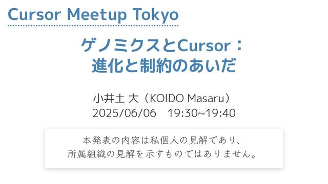 ゲノミクスとCursor: 進化と制約のあいだ 小井土 大(KOIDO Masaru) 2025/06/06 19:30~19:40 Cursor Meetup Tokyo 本発表の内容は私個人の見解であり、