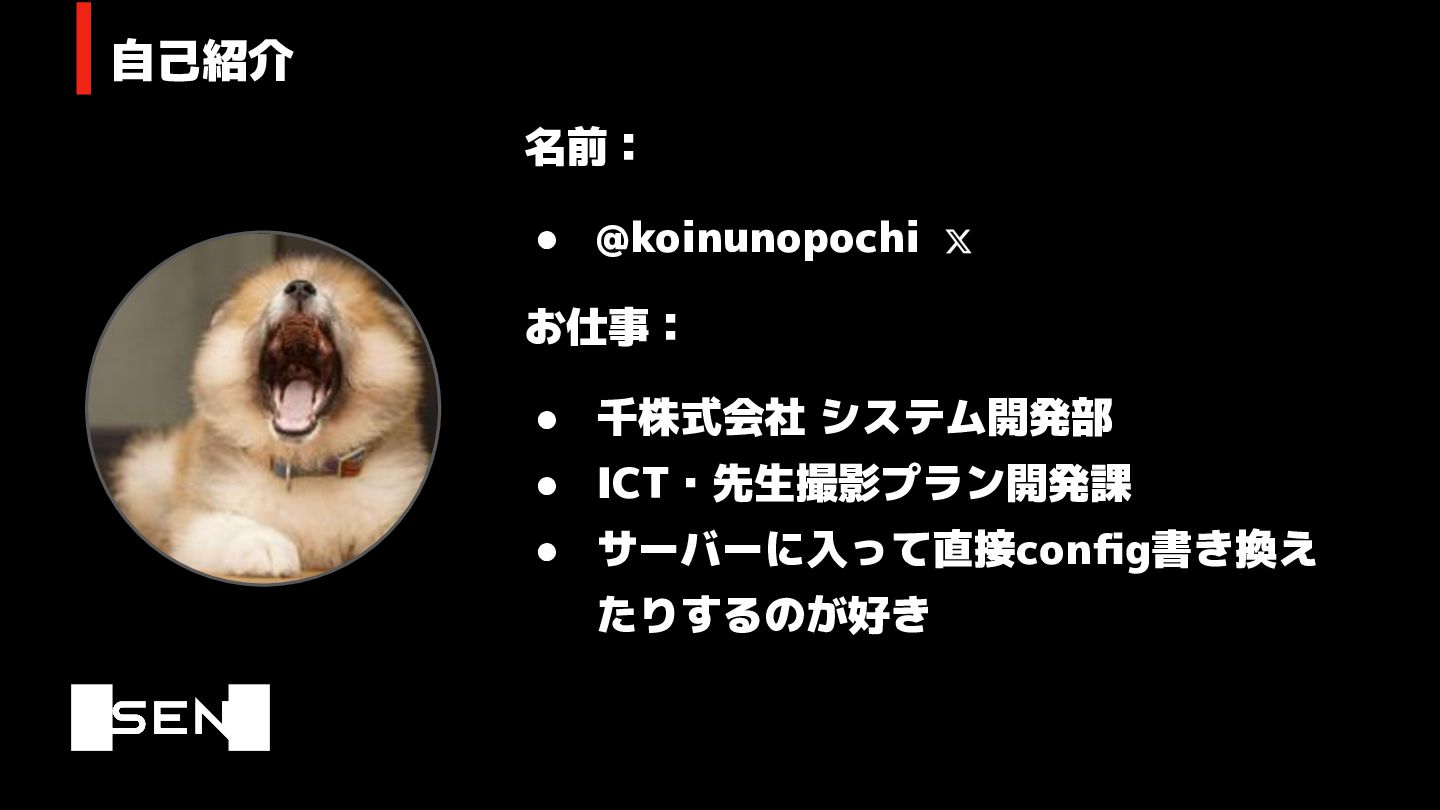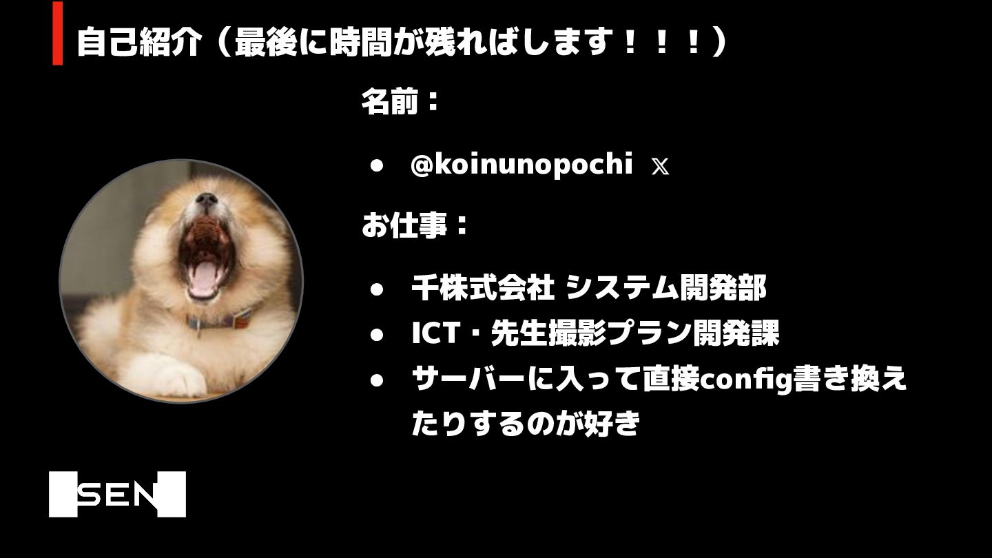 自己紹介(最後に時間が残ればします!!!) 名前: • @koinunopochi お仕事: • 千株式会社 システム開発部 • ICT・先生撮影プラン開発課