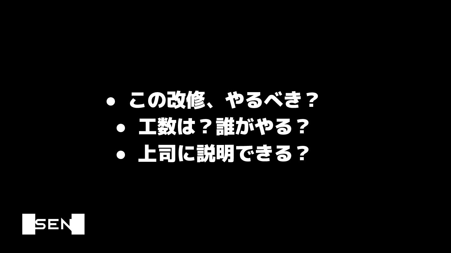 • この改修、やるべき? • 工数は?誰がやる? • 上司に説明できる?