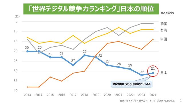 アラブ首長国連邦 6位 台湾 7位 アイルランド 8位 スウェーデン 9位 カタール 10位 オランダ 11位 カナダ 12位 ノルウェー 13位 アメリカ 14位 フィンランド 15位 アイスランド 16位 中国 17位 サウジアラビア 18位 オーストラリア 19位 ドイツ 20位 ルクセンブルク 21位 リトアニア 22位 バーレーン 23位 マレーシア 24位 ベルギー 25位 チェコ 26位 オーストリア 27位 韓国 28位 オマーン 29位 イギリス 30位 タイ 31位 ニュージーランド 32位 フランス 33位 エストニア 34位 カザフスタン 35位 日本 36位 クウェート 37位 ポルトガル 38位 ラトビア 39位 スペイン 40位 インドネシア 41位 インド 42位 チリ 43位 イタリア 44位 キプロス 45位 プエルトリコ 46位 スロベニア 47位 ヨルダン 48位 ハンガリー 49位 ルーマニア 50位 ギリシャ 51位 フィリピン 52位 ポーランド 53位 クロアチア 54位 コロンビア 55位 メキシコ 56位 ケニア 57位 ブルガリア 58位 ブラジル 59位 ボツワナ 60位 ペルー 61位 ガーナ 62位 アルゼンチン 63位 チェコスロバキア 64位 南アフリカ 65位 モンゴル 66位 トルコ 67位 ナイジェリア 68位 ナミビア 69位 ベネズエラ 出典:IMD「世界競争力ランキング」 12 参考