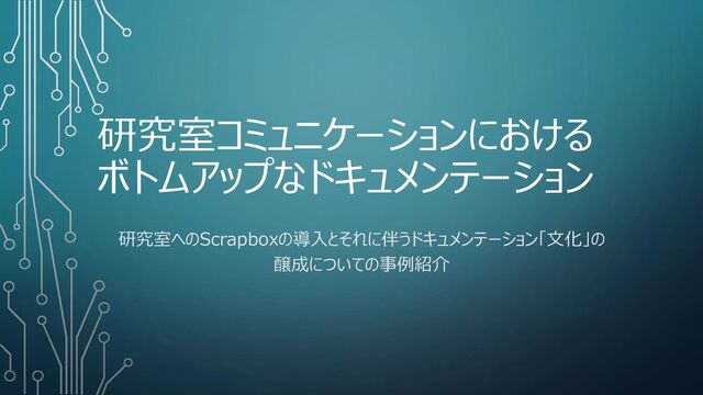 チームにおけるドキュメンテーションをうまく機能させる方法について、研究室においての実践を例に説明します。 今回のプレゼンテーションで説明する方法は - Scrapboxを推奨すること - 組織のメンバーの一人一人から、ボトムアップ的にドキュメンテーションが作成されることを目指すこと - 筆者の研究室において実践例が存在すること を特徴としています。