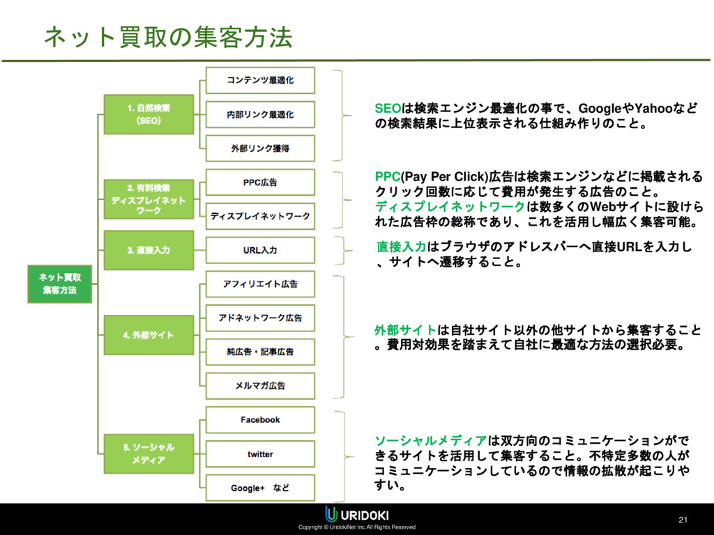 Copyright © UridokiNet Inc.All Rights Reserved 21 ネット買取の集客方法 SEOは検索エンジン最適化の事で、GoogleやYahooなど の検索結果に上位表示される仕組み作りのこと。
