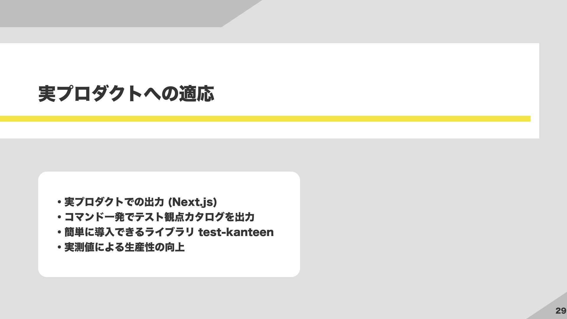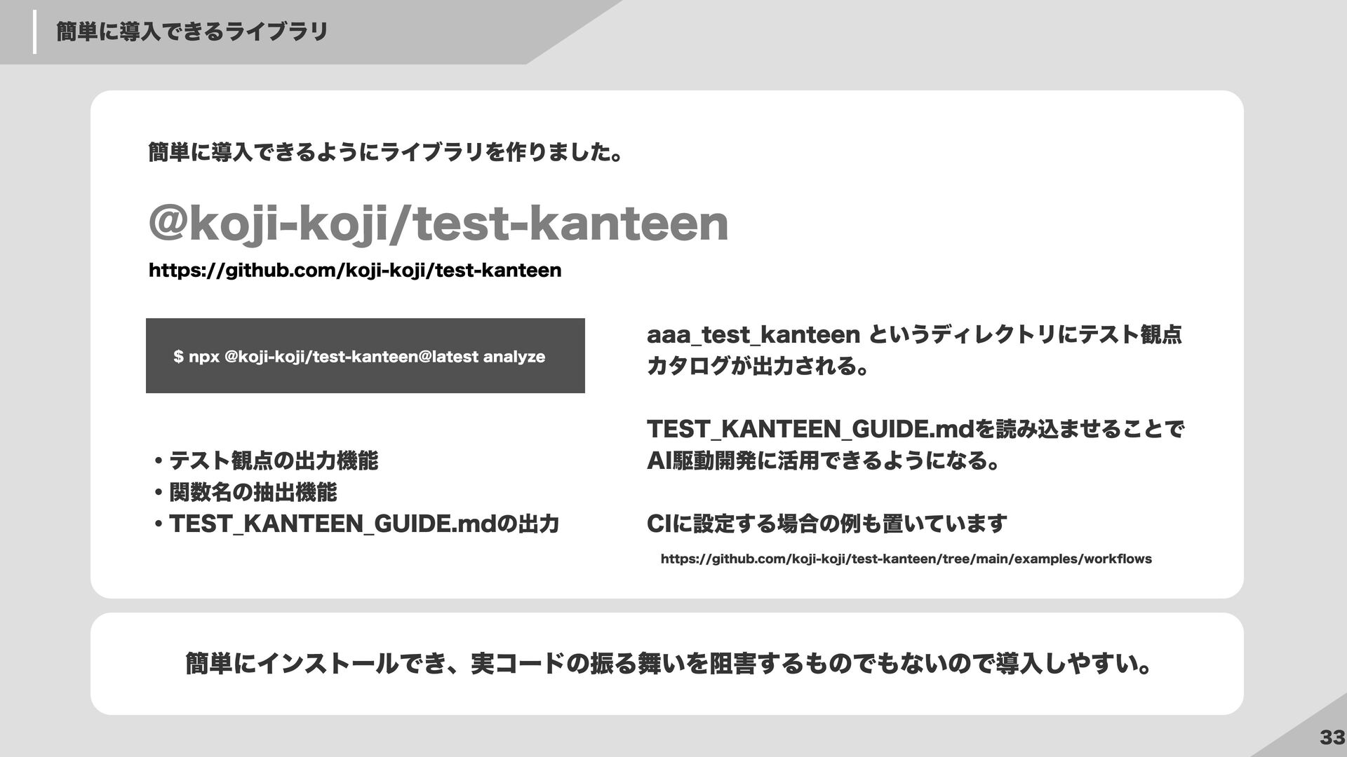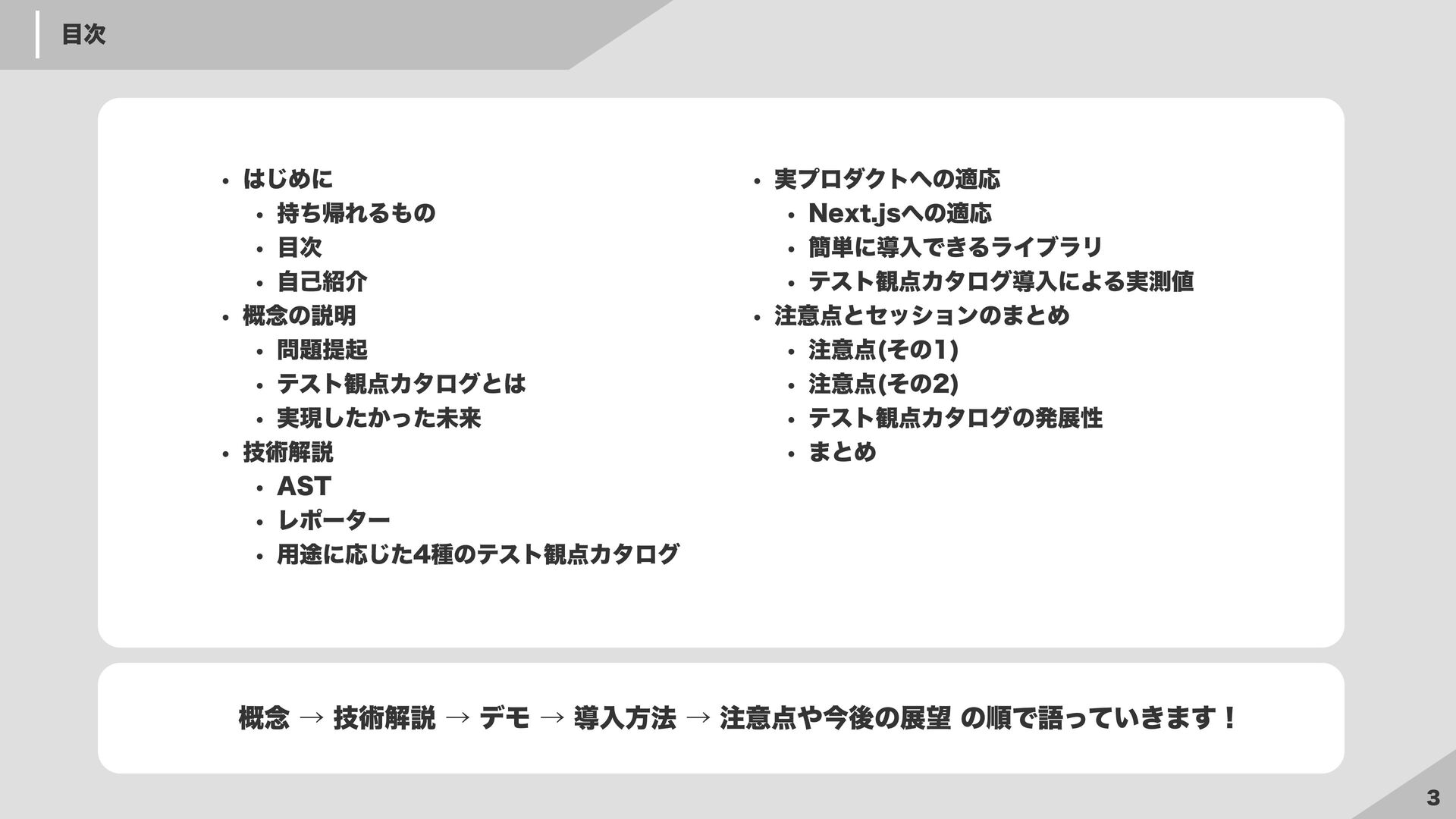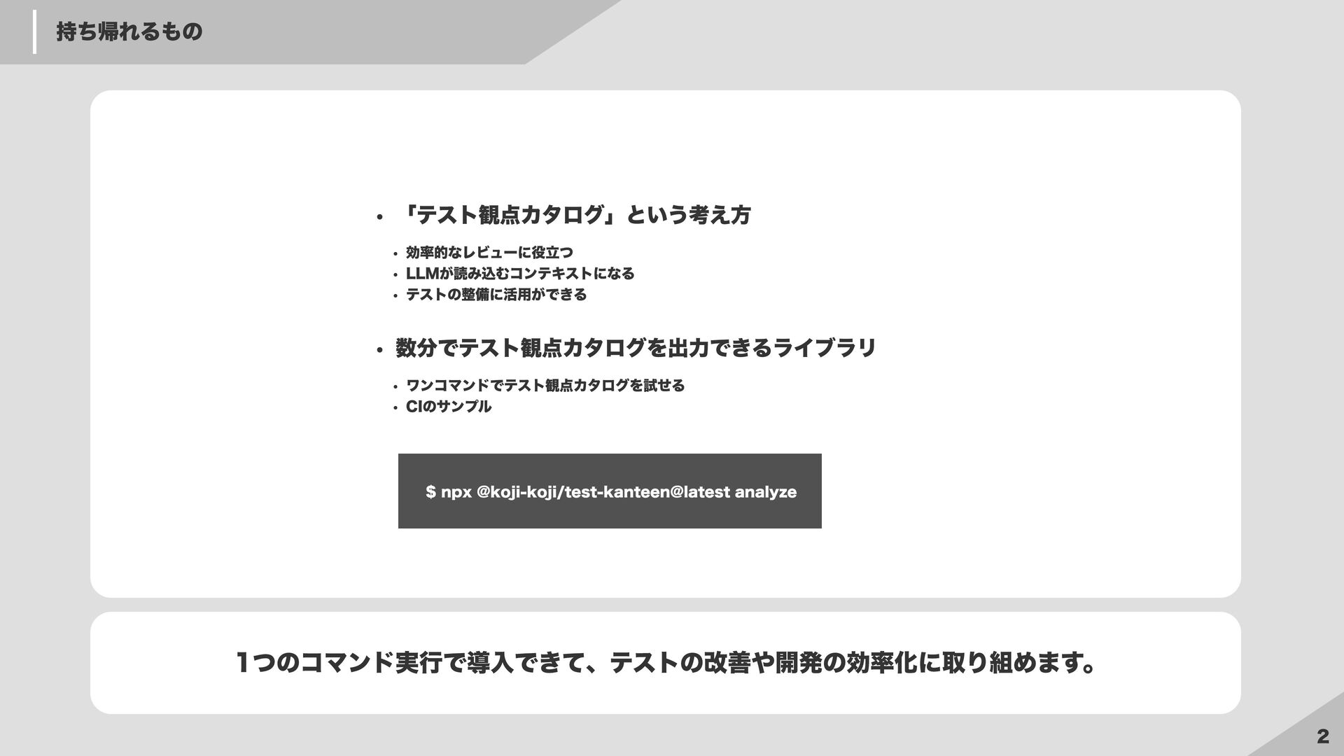 AST×Reporterでテストから“観点カタログ”を自動生成し、LLMと人間の共通Specにする LLMで実装が速くなる一方、仕様漏れ・デグレ・レビュー負荷が増えがちです。このセッションは、Jest/Vitest/PlaywrightのReporterとAST解析でテストから“観点カタログ”を自動生成し、人間とLLMが共有できるSpecとして運用する方法を紹介します。LLMはこのSpecを参照して文脈を把握し、人間はSpec差分をレビューするだけで仕様漏れやデグレを素早く察知することが可能になります。 再現デモと実測値で、レビュー時間短縮と不足観点の可視化の効果を示します。