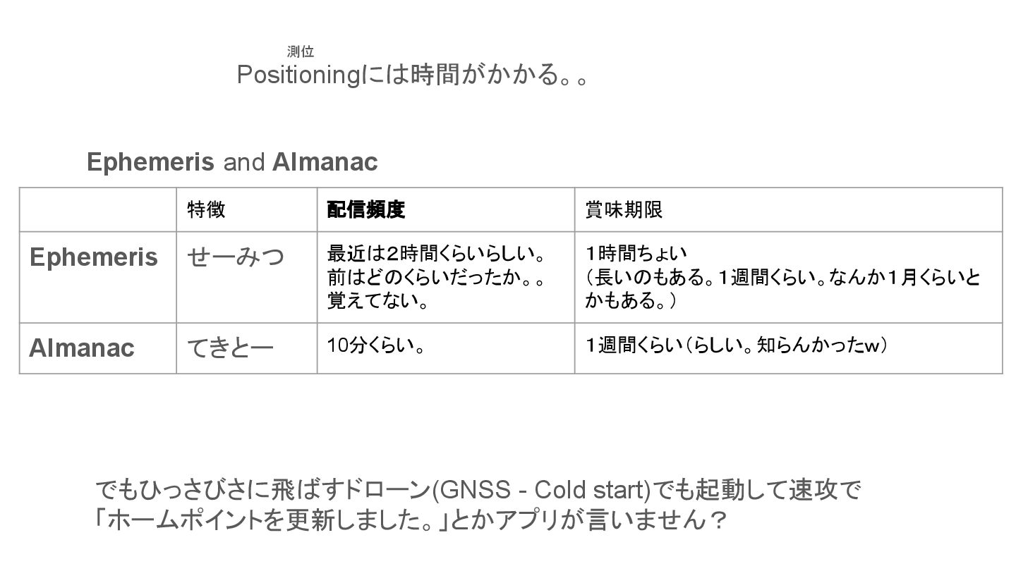 Positioningには時間がかかる。。 測位 Ephemeris and Almanac 特徴 配信頻度 賞味期限 Ephemeris せーみつ