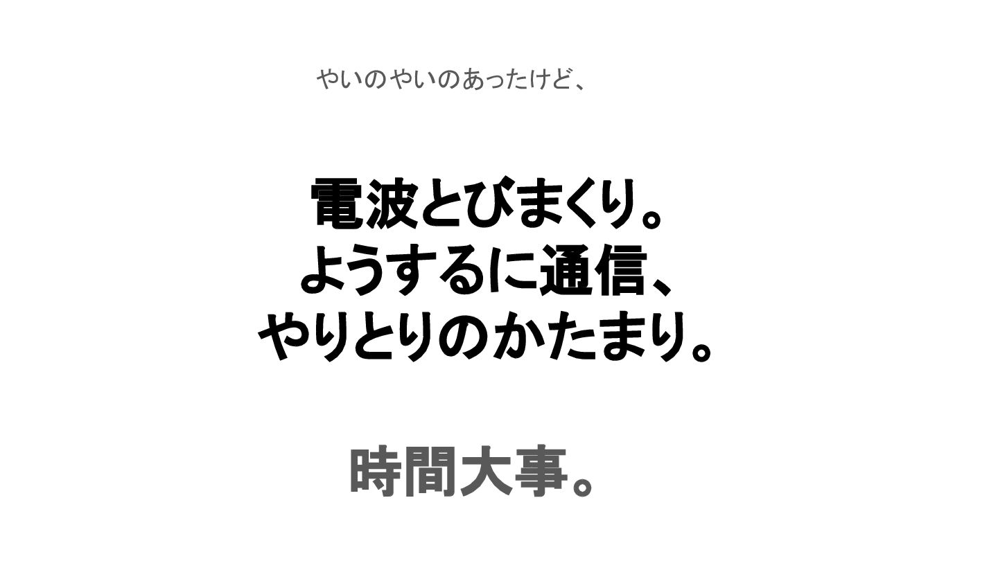 電波とびまくり。 ようするに通信、 やりとりのかたまり。 時間大事。 やいのやいのあったけど、