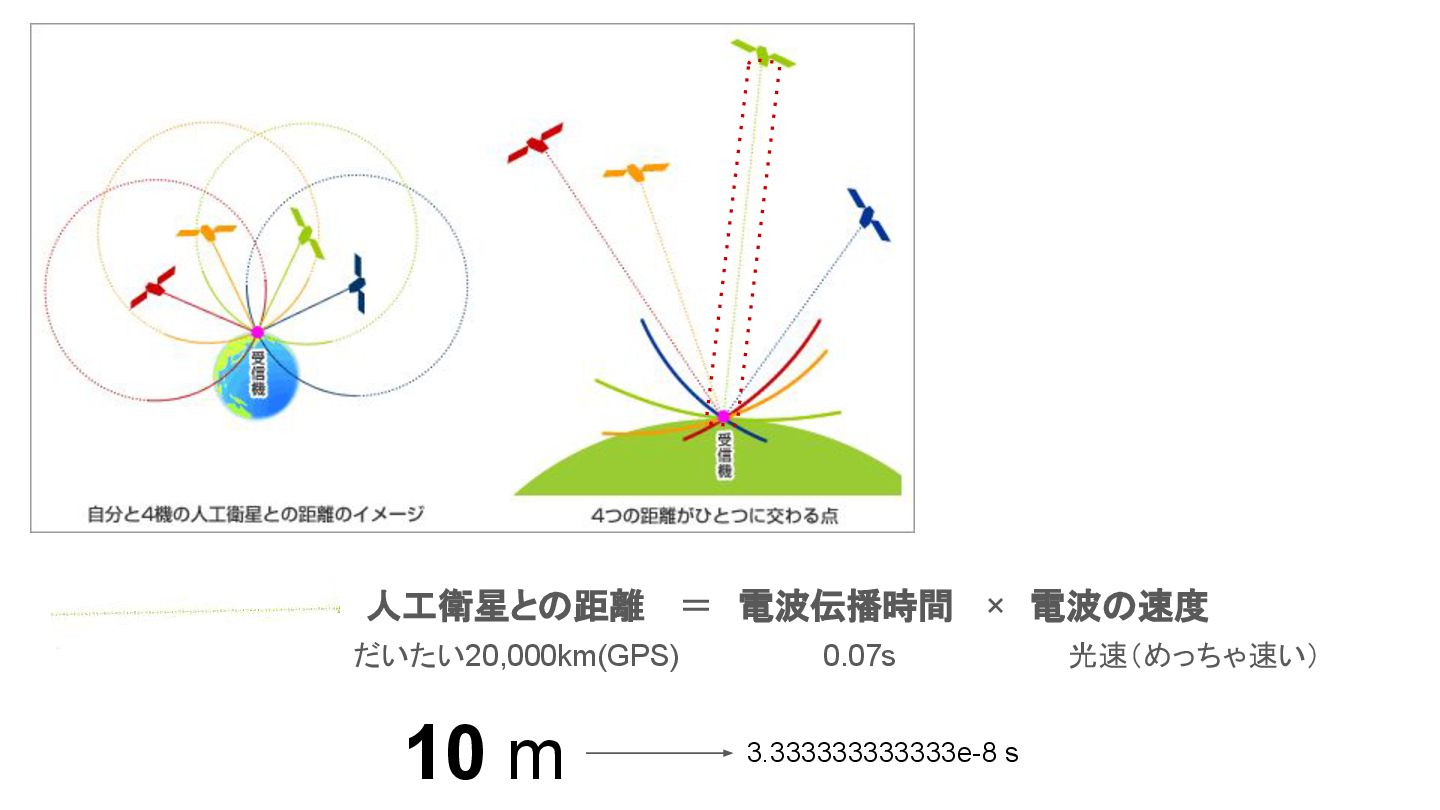 人工衛星との距離 = 電波伝播時間 × 電波の速度 だいたい20,000km(GPS) 光速(めっちゃ速い) 3.333333333333e-8 s 10 m 0.07s