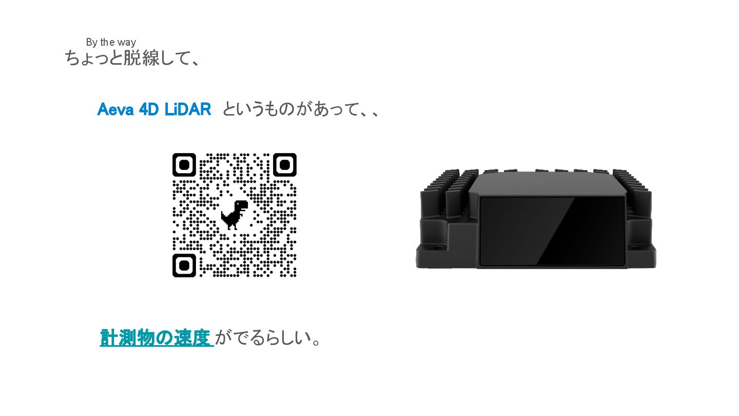 ちょっと脱線して、 By the way Aeva 4D LiDAR というものがあって、、 計測物の速度 がでるらしい。