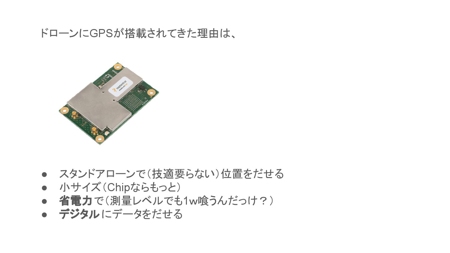 • スタンドアローンで(技適要らない)位置をだせる • 小サイズ(Chipならもっと) • 省電力で(測量レベルでも1w喰うんだっけ?) • デジタルにデータをだせる ドローンにGPSが搭載されてきた理由は、