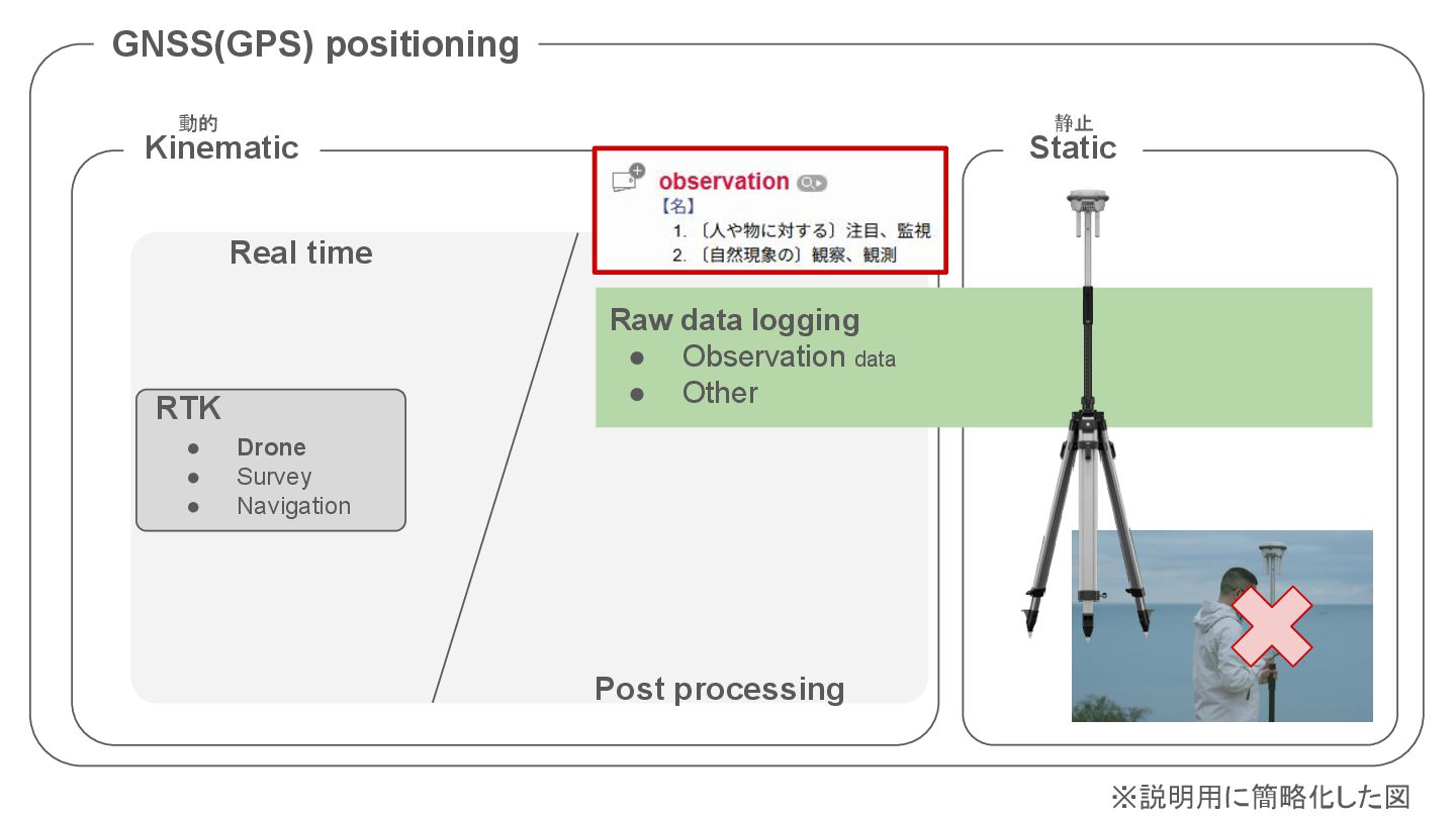 • Drone • Survey • Navigation Raw data logging • Observation data • Other 静止 動的