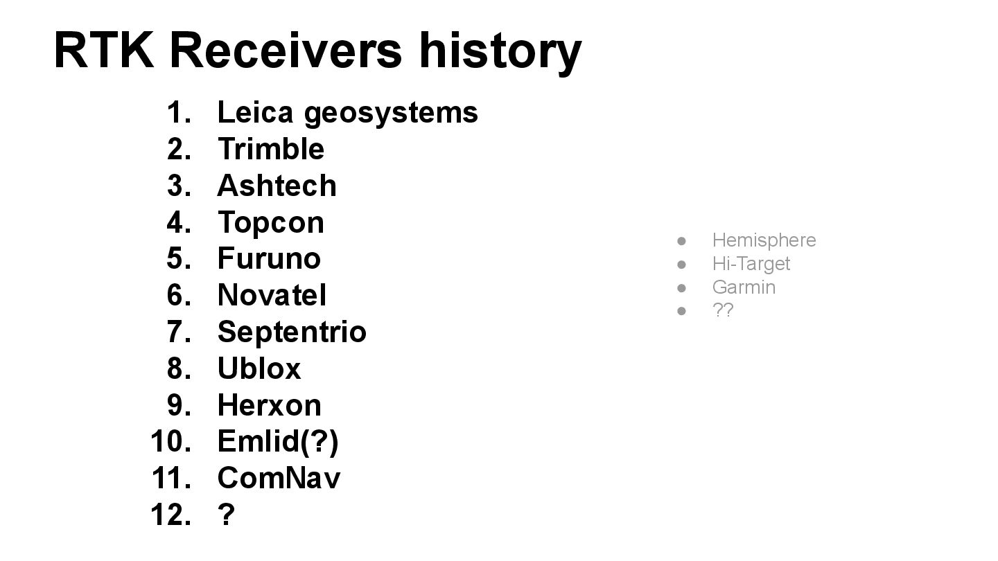 Furuno 6. Novatel 7. Septentrio 8. Ublox 9. Herxon 10. Emlid(?) 11. ComNav 12. ? RTK Receivers history • Hemisphere • Hi-Target • Garmin • ??