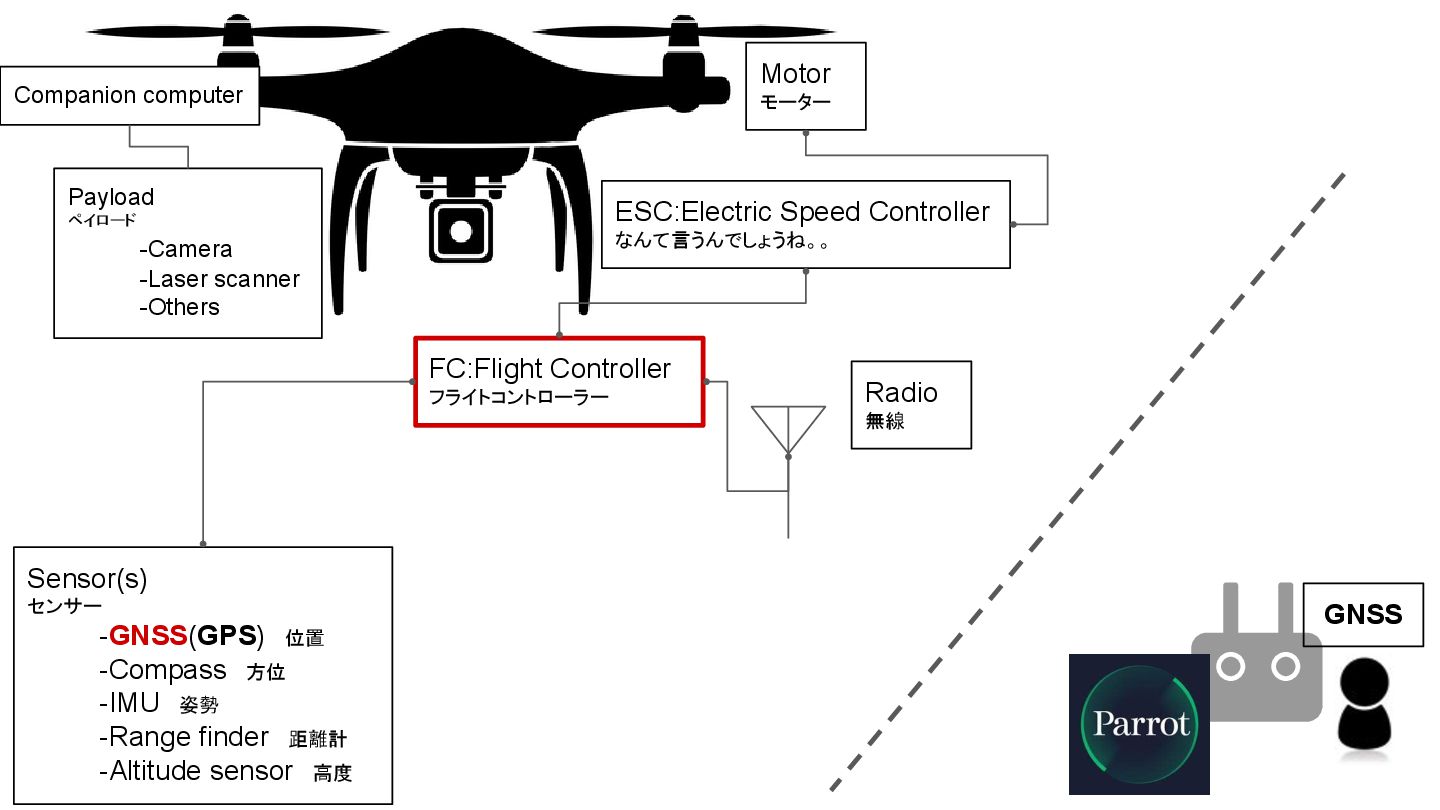 FC:Flight Controller フライトコントローラー Sensor(s) センサー -GNSS(GPS) 位置 -Compass 方位 -IMU 姿勢 -Range finder 距離計