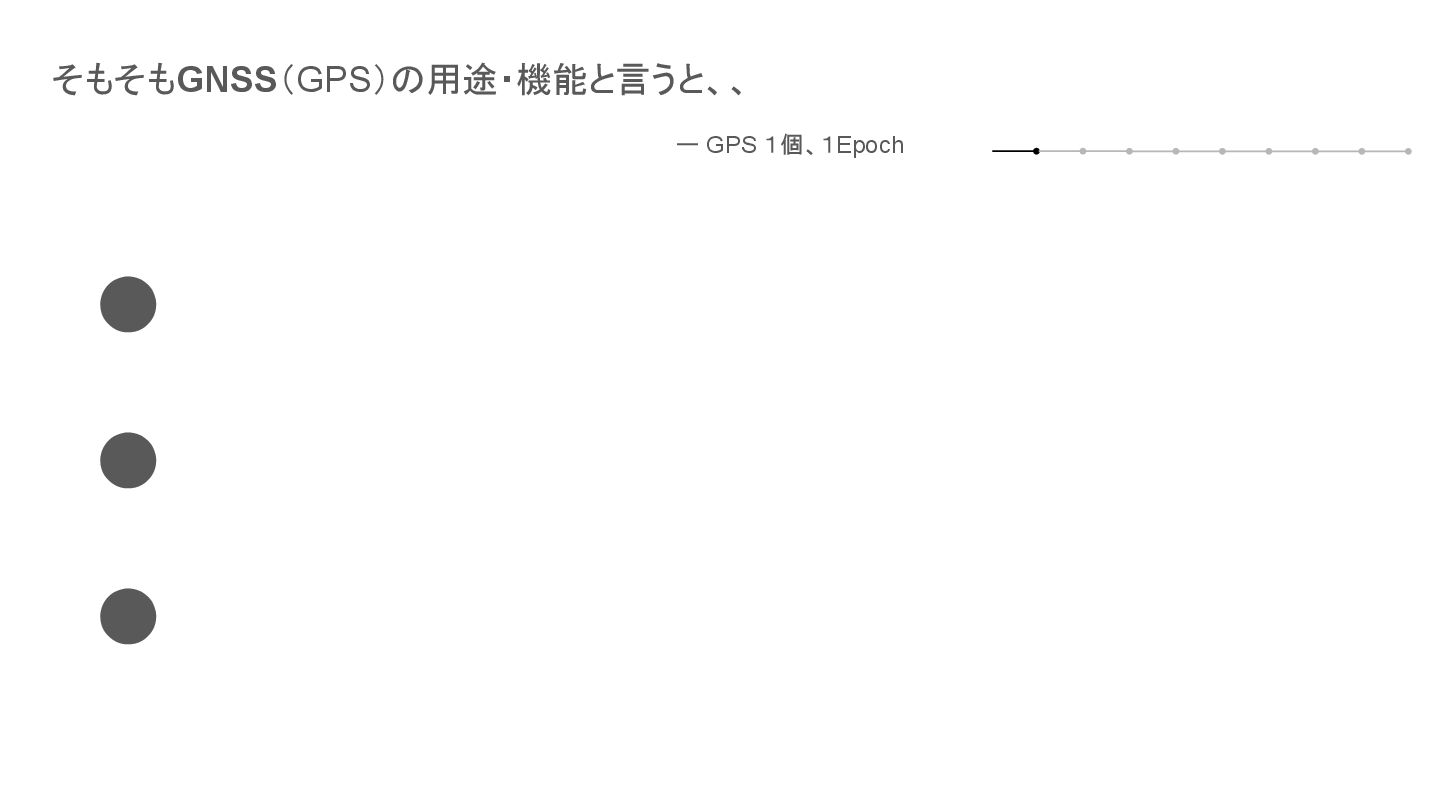 そもそもGNSS(GPS)の用途・機能と言うと、、 • 位置がわかる。 • 時間がわかる。 • 速度がわかる。 ー GPS 1個、1Epoch