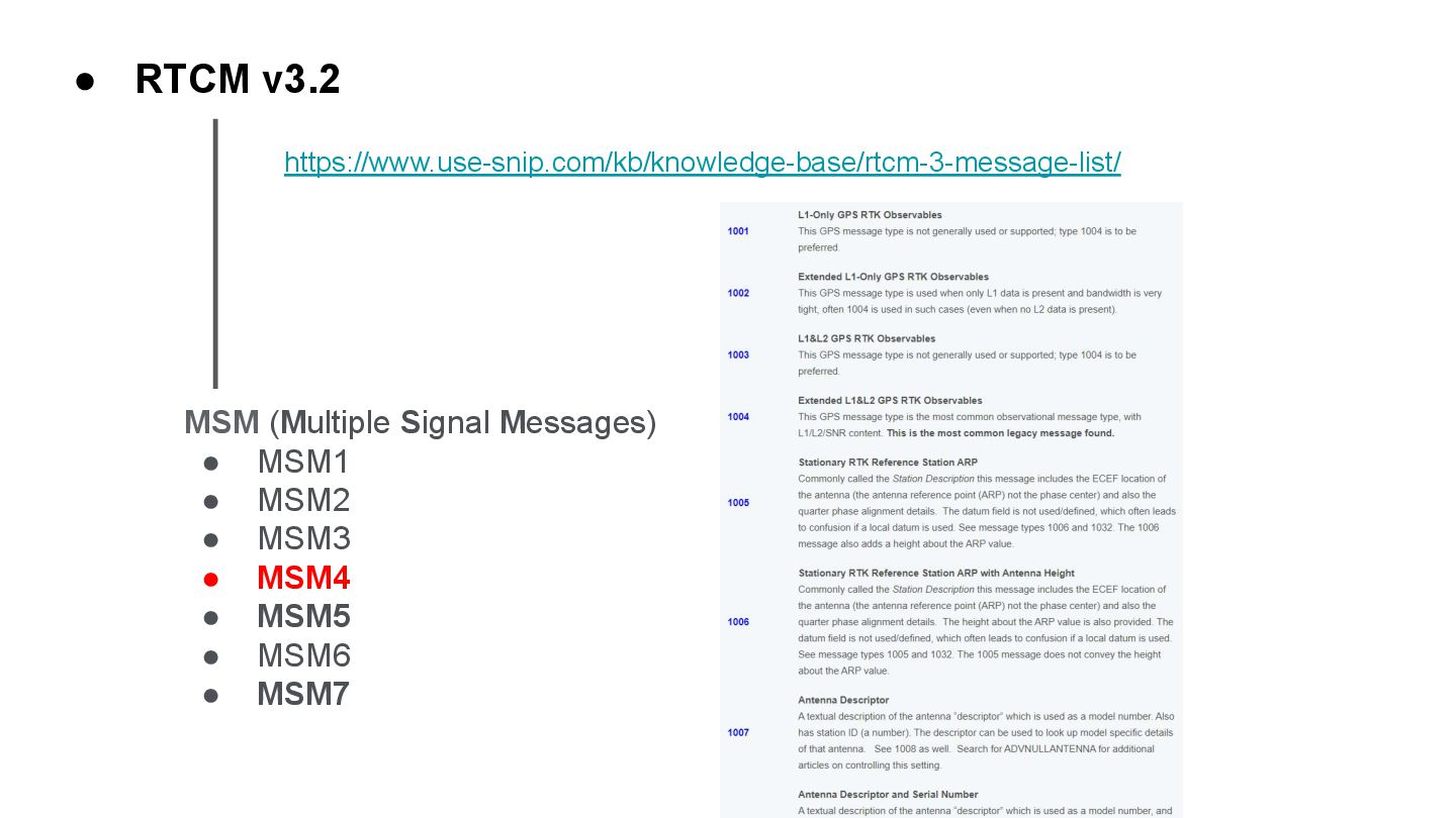 • RTCM v3.2 https://www.use-snip.com/kb/knowledge-base/rtcm-3-message-list/ MSM (Multiple Signal Messages) • MSM1