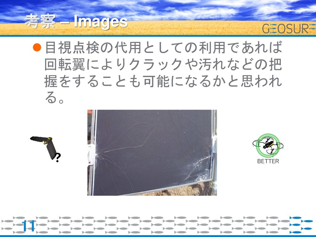 目視点検の代用としての利用であれば 回転翼によりクラックや汚れなどの把 握をすることも可能になるかと思われ る。 11 考察 – Images BETTER