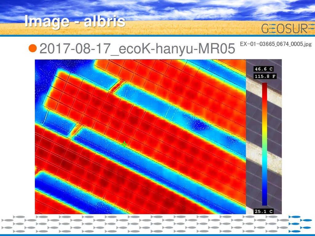 後述するeBee ThermoMAPによるオル ソ画像よりも詳細の確認が可能である が、独自フレームを含んだJPEG圧縮に より解析ができないため、局部的な確 認やリアルタイムでの確認にむくと思 われる。 13 考察 –