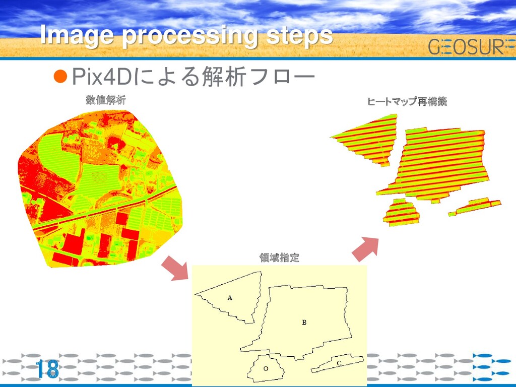 Pix4Dによる解析フロー 18 Image processing steps 数値解析 ヒートマップ再構築 領域指定