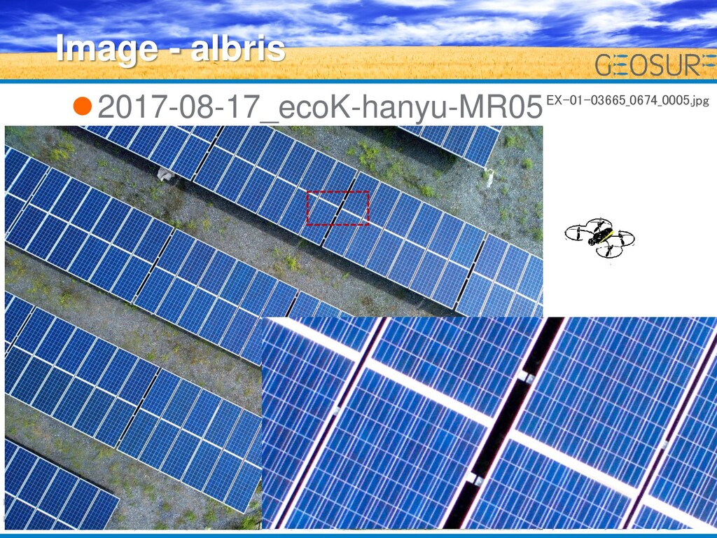 当然ではあるが、固定翼(eBee)と回転 翼では撮影高度・イメージセンサー解 像度に差があるため取得できる画像に 大きく差がある。 10 考察 – Images