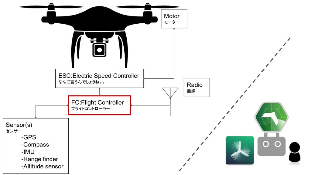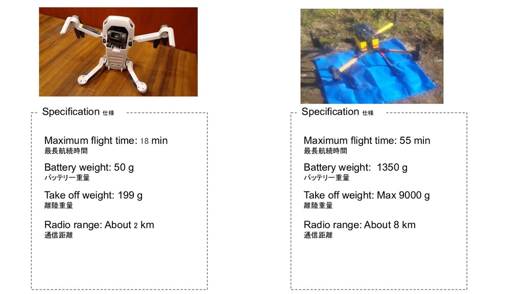 バッテリー重量 Take off weight: 199 g 離陸重量 Radio range: About 2 km 通信距離 Specification 仕様 Maximum flight time: 55 min 最長航続時間 Battery weight: 1350 g バッテリー重量 Take off weight: Max 9000 g 離陸重量 Radio range: About 8 km 通信距離 Specification 仕様