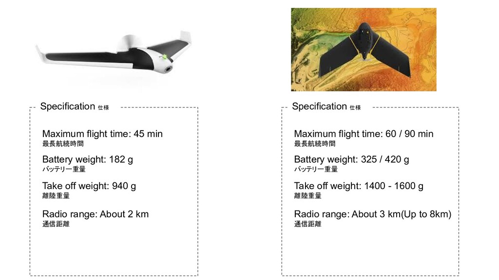 バッテリー重量 Take off weight: 940 g 離陸重量 Radio range: About 2 km 通信距離 Specification 仕様 Maximum flight time: 60 / 90 min 最長航続時間 Battery weight: 325 / 420 g バッテリー重量 Take off weight: 1400 - 1600 g 離陸重量 Radio range: About 3 km(Up to 8km) 通信距離 Specification 仕様